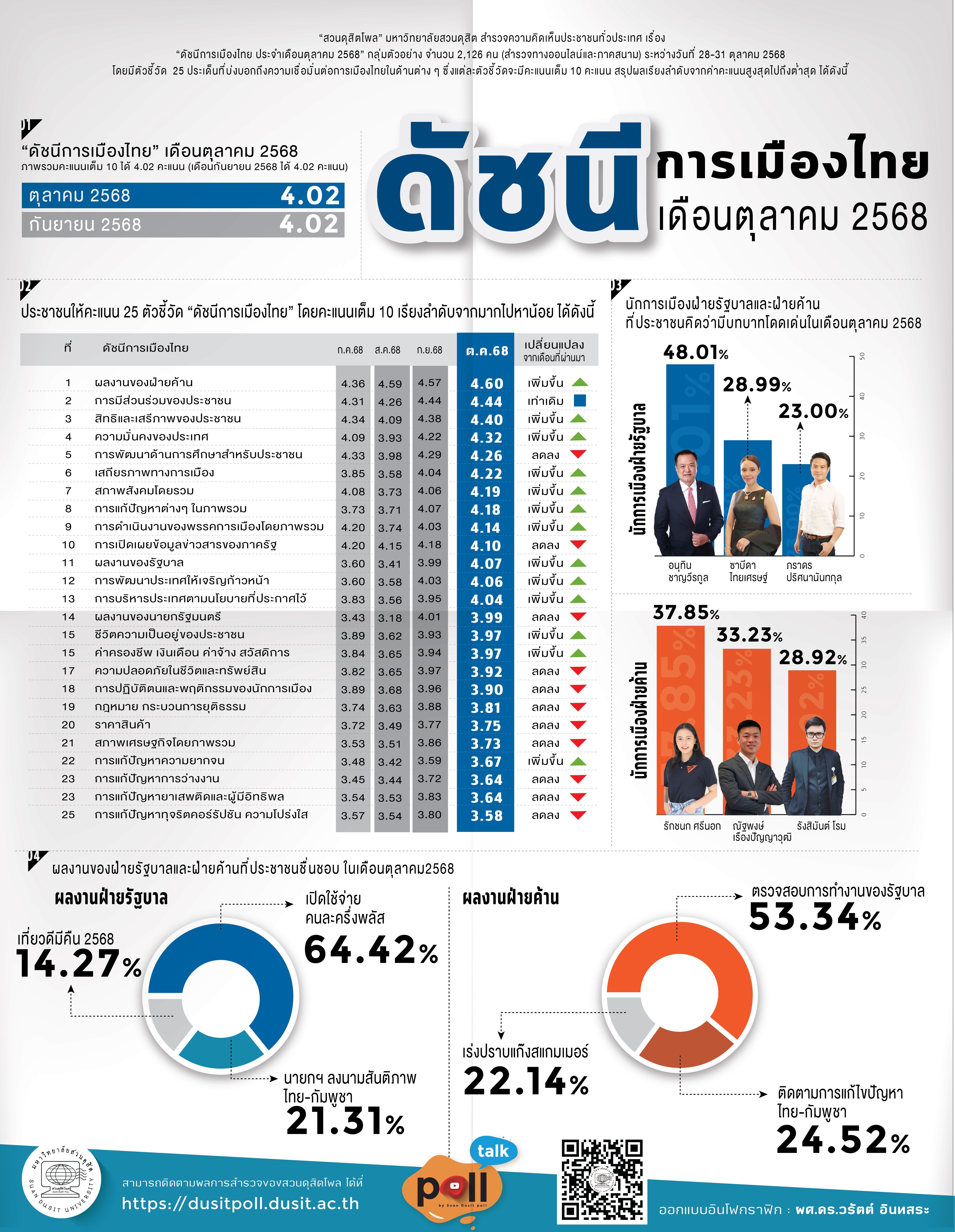 นางสาวพรพรรณ บัวทอง ประธานสวนดุสิตโพล มหาวิทยาลัยสวนดุสิต เผยผลสำรวจความคิดเห็นประชาชนทั่วประเทศ เรื่อง “ดัชนีการเมืองไทย ประจำเดือนตุลาคม 2568” กลุ่มตัวอย่าง จำนวน 2,126 คน (สำรวจทางออนไลน์และภาคสนาม) ระหว่างวันที่ 28-31 ตุลาคม 2568 พบว่า กลุ่มตัวอย่างให้คะแนนภาพรวมดัชนีการเมืองไทยประจำเดือนตุลาคม 2568 เฉลี่ย 4.02 คะแนนเท่ากับเดือนกันยายน 2568 ที่ได้ 4.02 คะแนน