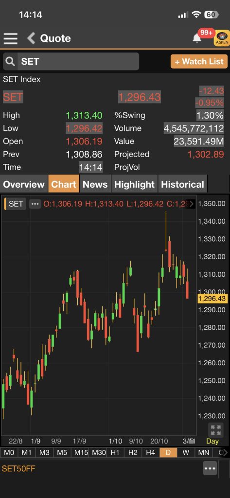 - เมื่อเวลา 14.14 น.ดัชนี SET มาอยู่ที่ 1,296.43 จุด ลดลง 12.43 จุด