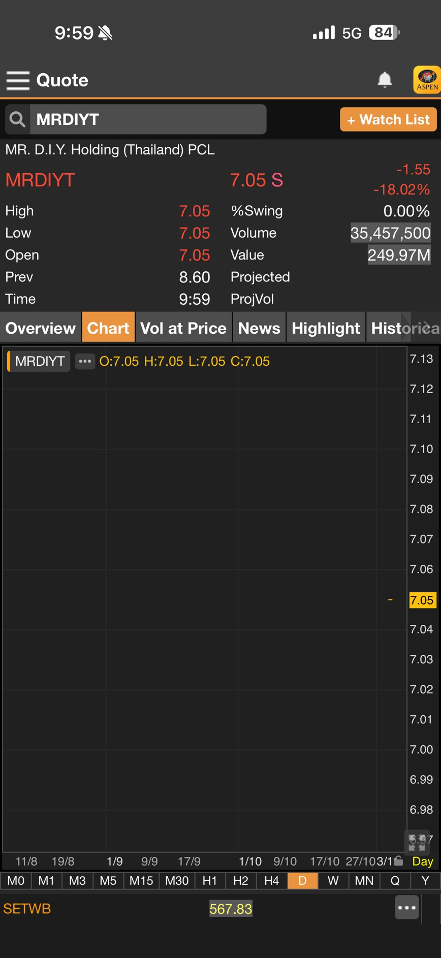 หุ้น MRDIYT เปิดเทรดวันแรกที่ 7.05 บาท ลดลง 1.55 บาท หรือลดลง 18.02% จากราคา IPO 8.60 บาท
