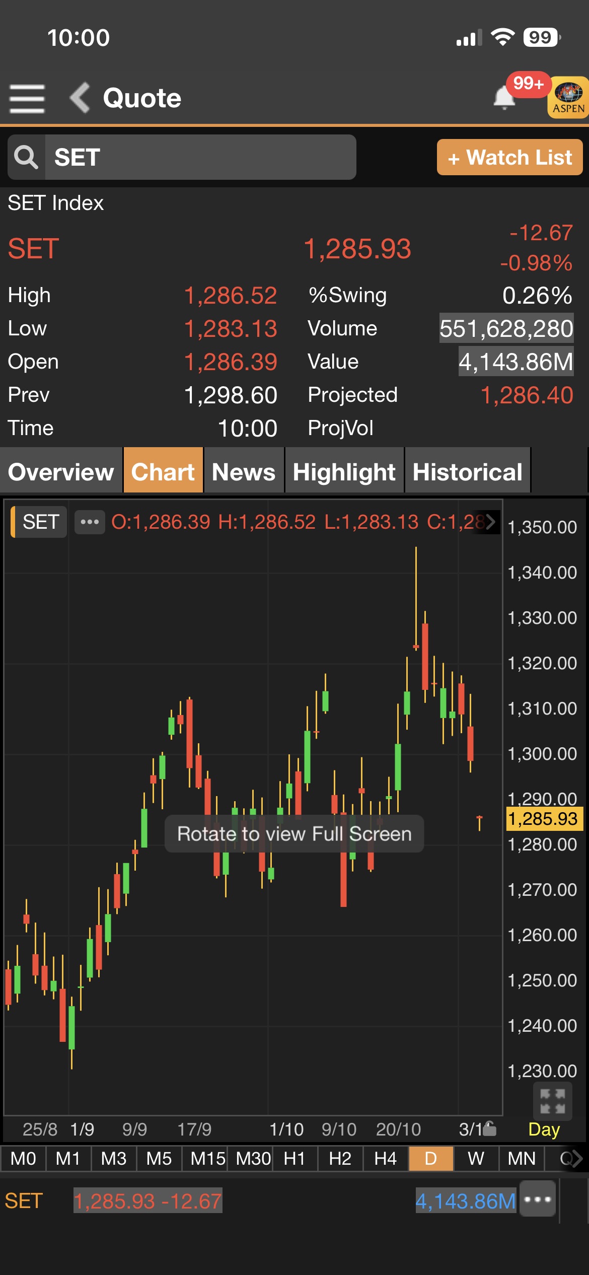 - เมื่อเวลา 10.00 น.ดัชนี SET อยู่ที่ 1,285.93 จุด ลดลง 12.67 จุด (-0.98%)