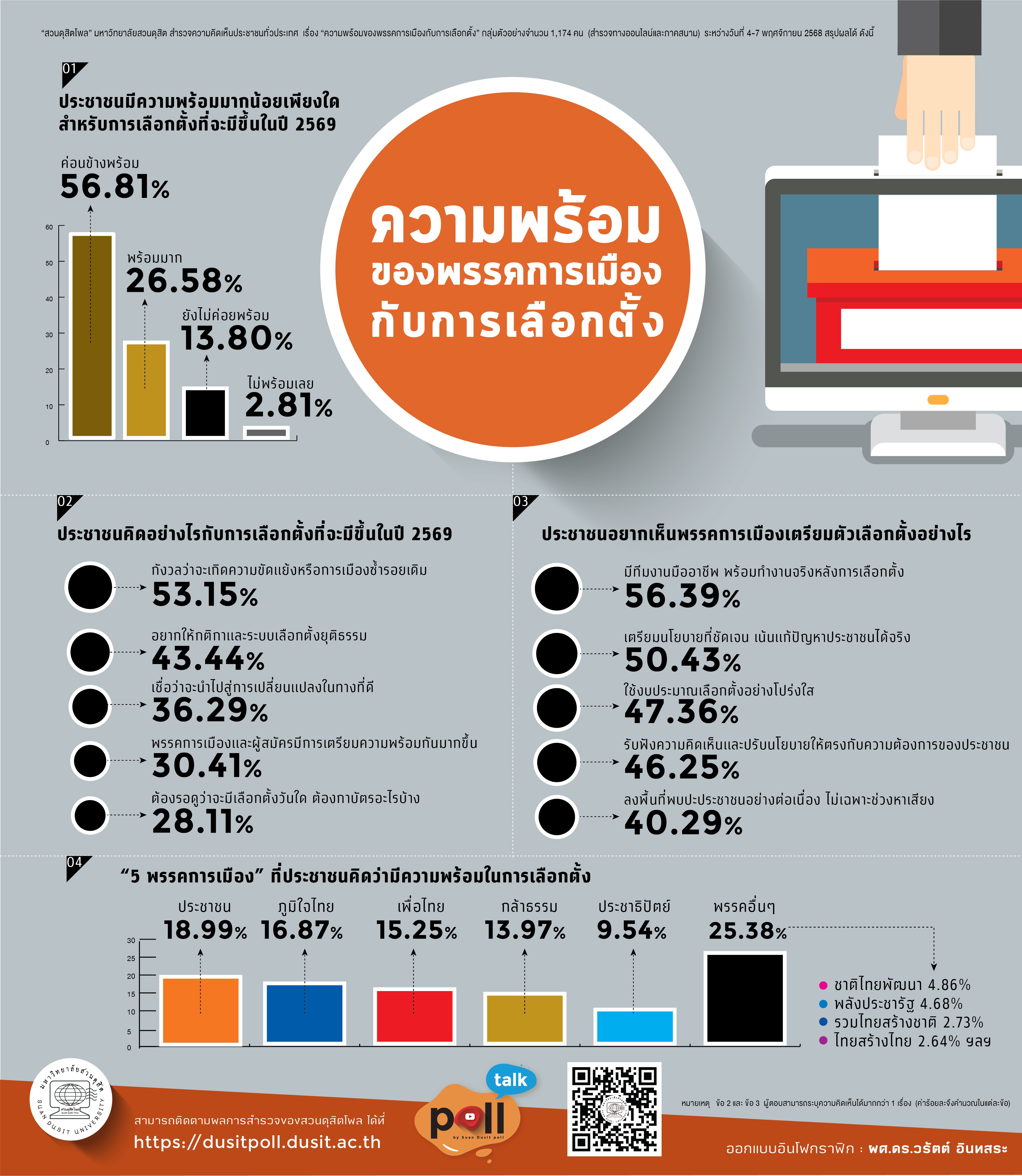 สวนดุสิตโพล มหาวิทยาลัยสวนดุสิต เผยผลสำรวจความคิดเห็นเรื่อง “ความพร้อมของพรรคการเมืองกับการเลือกตั้ง” จากประชาชนกลุ่มตัวอย่างทั่วประเทศจำนวน 1,174 คน (สำรวจทางออนไลน์และภาคสนาม) ระหว่างวันที่ 4-7 พ.ย.ที่ผ่านมา โดยกลุ่มตัวอย่างส่วนใหญ่ค่อนข้างพร้อมสำหรับการเลือกตั้งที่จะมีขึ้นในปี 2569 โดยมองว่าการเลือกตั้งใหญ่ที่จะมีขึ้นอาจจะเกิดความขัดแย้งหรือการเมืองซ้ำรอยเดิม ทั้งนี้อยากเห็นพรรคการเมืองเตรียมทีมงานมืออาชีพพร้อมทำงานจริงหลังการเลือกตั้ง โดยพรรคการเมืองที่มองว่ามีความพร้อมรับศึกเลือกตั้งมากที่สุด คือ พรรคประชาชน รองลงมาคือ พรรคภูมิใจไทย และพรรคเพื่อไทย