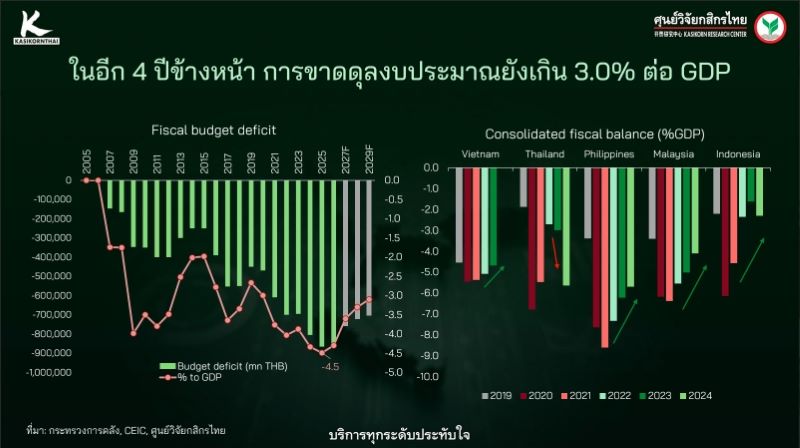 น.ส.ปริชญา ฤทธิ์สุข นักวิจัย บริษัท ศูนย์วิจัยกสิกรไทย จำกัด กล่าวว่า แนวทางลดขาดดุลการคลังของไทย อาจไปที่การเพิ่มรายได้ภาครัฐ เนื่องจากรายจ่ายส่วนใหญ่ เป็นรายการที่ปรับลดได้ยาก ในระยะสั้น มาตรการเพิ่มรายได้แบบเฉพาะจุด (Piecemeal) อาจช่วยประคองสถานการณ์ได้บ้าง แต่ในระยะปานกลางถึงยาว การปฏิรูปการคลังอย่างยั่งยืน จำเป็นต้องพึ่งพาการพัฒนาฐานข้อมูลที่มีประสิทธิภาพเพื่อออกแบบนโยบายสวัสดิการอย่างตรงเป้า ควบคู่กับการขยายฐานภาษี และการปฏิรูปโครงสร้างเศรษฐกิจ