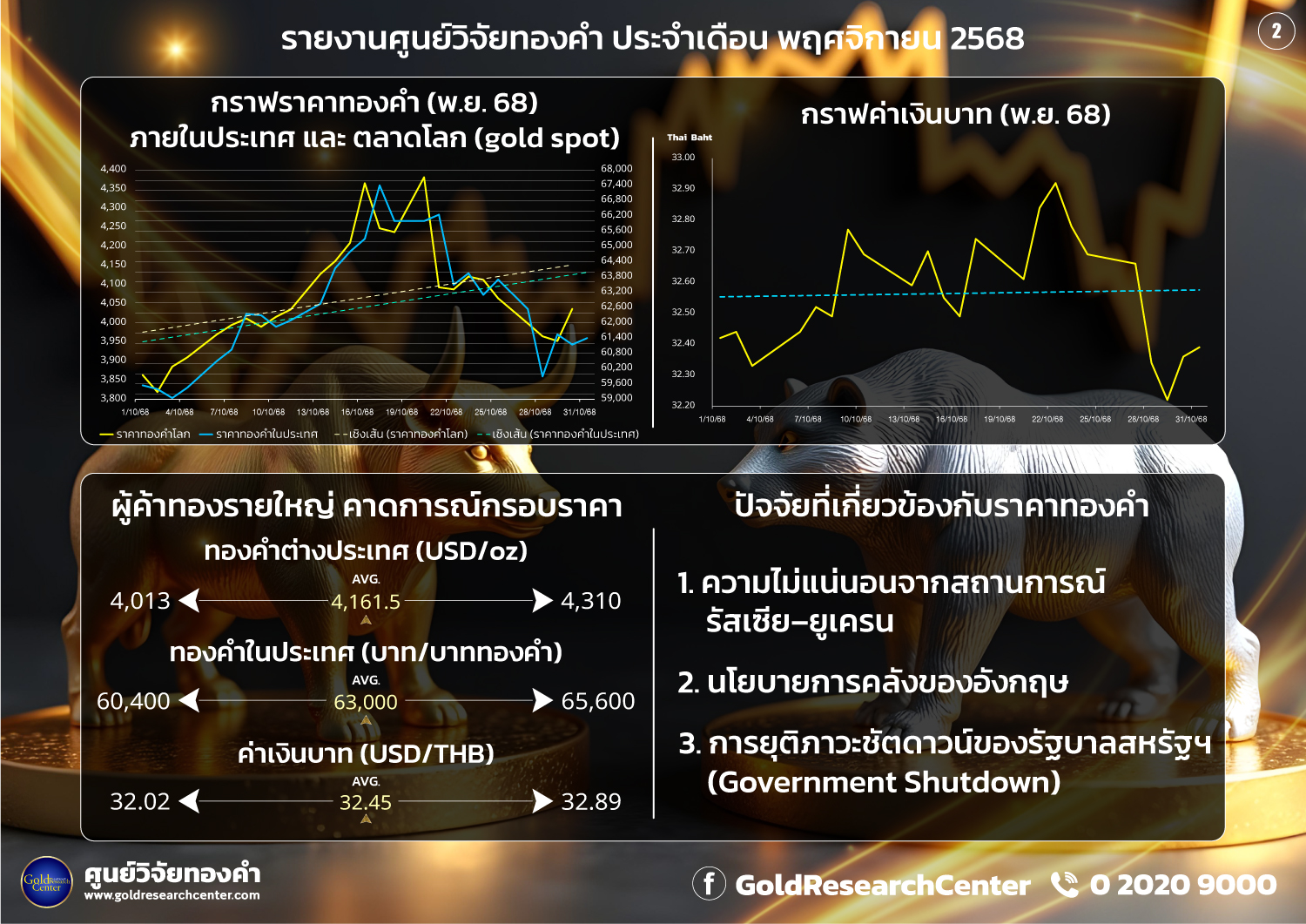 สำหรับการคาดการณ์กรอบราคาทองคำในเดือน พ.ย.68 ของผู้ประกอบกิจการค้าทองคำรายใหญ่มีมุมมอง ดังนี้ ราคาทองคำตลาดโลก (Gold Spot) ให้กรอบเฉลี่ยบริเวณ 4,013-4,310 ดอลลาร์/ออนซ์ ด้านราคาทองคำแท่งในประเทศความบริสุทธิ์ 96.5% ให้กรอบเฉลี่ยบริเวณ 60,400-65,600 บาท/น้ำหนัก 1 บาททองคำ และค่าเงินบาทให้กรอบเฉลี่ยบริเวณ 32.02-32.89 บาท/ดอลลาร์