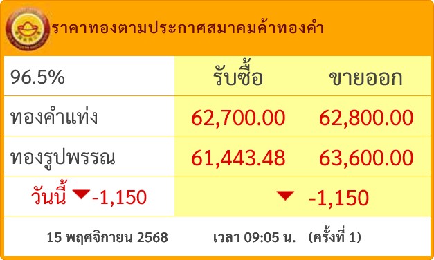 ราคาทองคำ (96.5%) ขายปลีกในประเทศ เปิดตลาดเช้านี้ปรับลงต่อเนื่อง 1,150 บาท หลังจากเมื่อวานราคาร่วงแรง 800 บาท