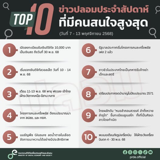 ส่วนข่าวปลอมอันดับ 2 เรื่อง “เริ่มแจกเงินดิจิทัลวอลเล็ต วันที่ 10 – 14 พ.ย. 68” ซึ่งได้รับการตรวจสอบจากกลุ่มสารนิเทศการคลัง กระทรวงการคลัง แล้วพบว่าไม่เป็นความจริง ซึ่งรัฐบาลชุดปัจจุบันยังไม่มีโครงการใด ๆ ที่เกี่ยวข้องกับการลงทะเบียนเงินดิจิทัลวอลเล็ต ดังนั้นข้อมูลดังกล่าวจึงเป็นข้อมูลเท็จ