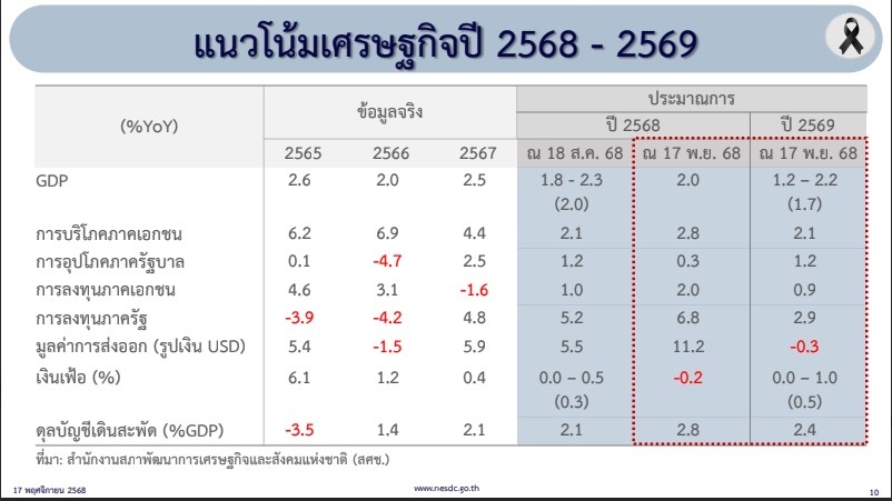 สำนักงานสภาพัฒนาการเศรษฐกิจและสังคมแห่งชาติ (สศช.) หรือสภาพัฒน์ คาดการณ์แนวโน้มเศรษฐกิจไทยปี 2568 โดยประเมินว่าจะขยายตัวได้ 2.0% ส่วนในปี 2569 คาดว่าจะขยายตัวได้ 1.7% (กรอบ 1.2-2.2%) โดยมองว่า ในปีหน้าการลงทุนจากภาครัฐจะมีส่วนสำคัญในการช่วยขับเคลื่อนเศรษฐกิจของประเทศ ซึ่งการที่รัฐบาลเร่งจัดงบประมาณปี 70 ถือว่าเป็นสิ่งสำคัญมาก เพราะหากงบประมาณมีความล่าช้า จะส่งผลต่อการเบิกจ่ายเป็นอย่างมาก โดยเฉพาะงบลงทุน ซึ่งจะเป็นเม็ดเงินที่จะไหลเข้าสู่ระบบเศรษฐกิจ โดยเฉพาะภาคการก่อสร้าง