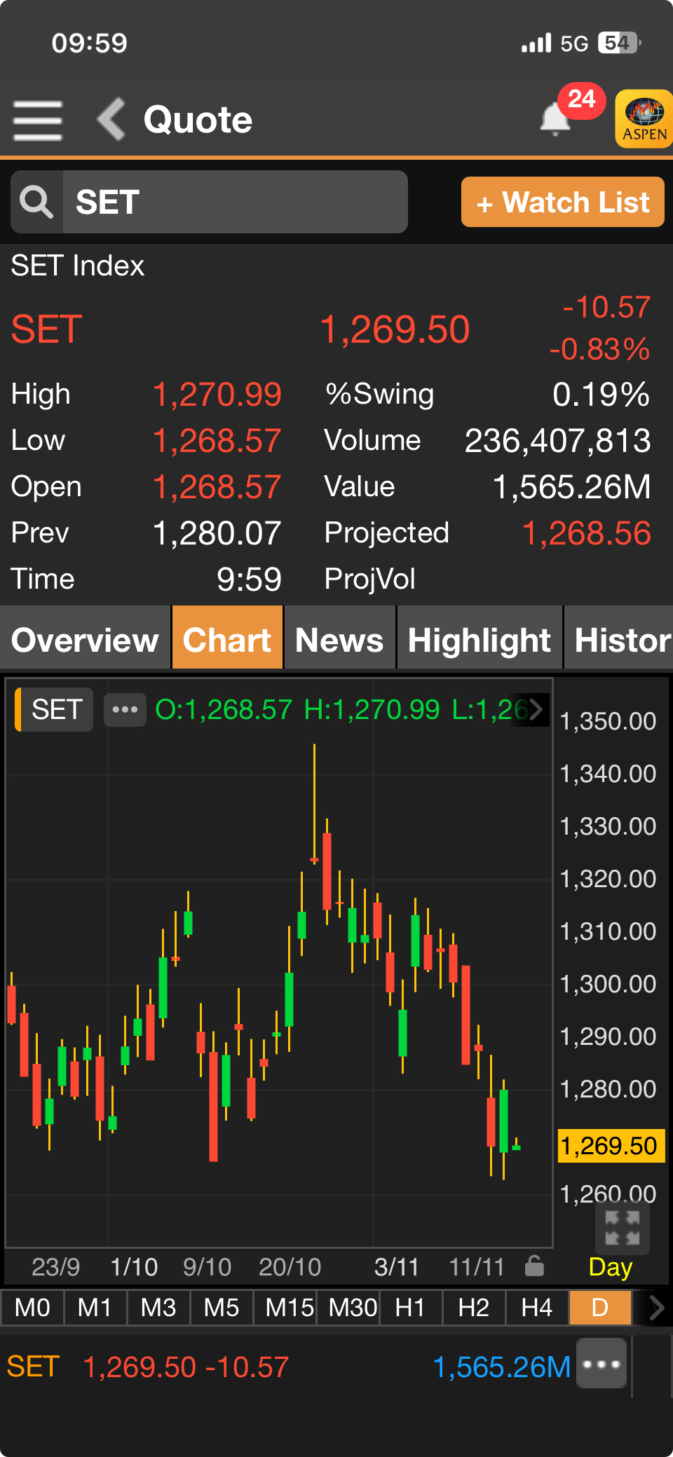 เมื่อเวลา 9.59 น.ดัชนี SET มาอยู่ที่ 1,269.50 จุด ลดลง 10.57 จุด (-0.83%)
