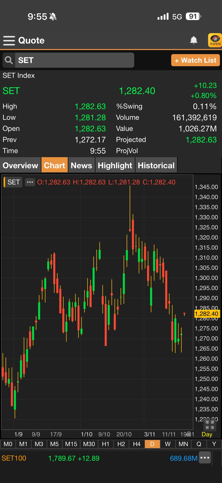 เมื่อเวลา 9.55 น.ดัชนี SET มาอยู่ที่ 1,282.40 จุด เพิ่มขึ้น 10.23 จุด
