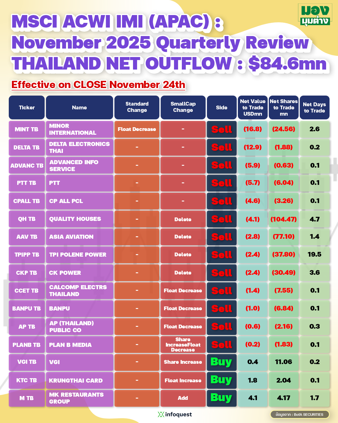 ล่าสุด ในช่วงเย็นของวันที่ 24 พฤศจิกายน2568 ก่อนปิดตลาดหุ้น จะมียอดการลดน้ำหนักการลงทุนใน MSCI (Outflow) จำนวน 84.6 ล้านดอลลาร์สหรัฐ โดยแบ่งเป็น Total Buy จำนวน 9.1 ล้านดอลล่าร์สหรัฐ และ Total Sell จำนวน 93.8 ล้านดอลลาร์สหรัฐ