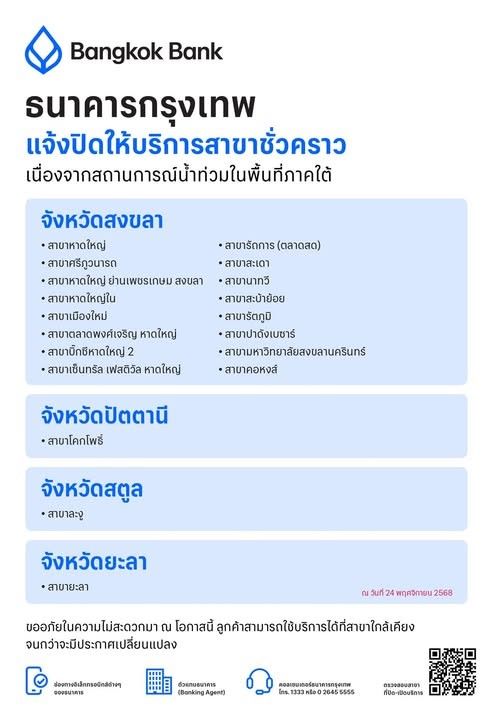แบงก์กรุงเทพ (BBL) แจ้งปิดบริการสาขาชั่วคราว เนื่องจากน้ำท่วม ดังนี้
