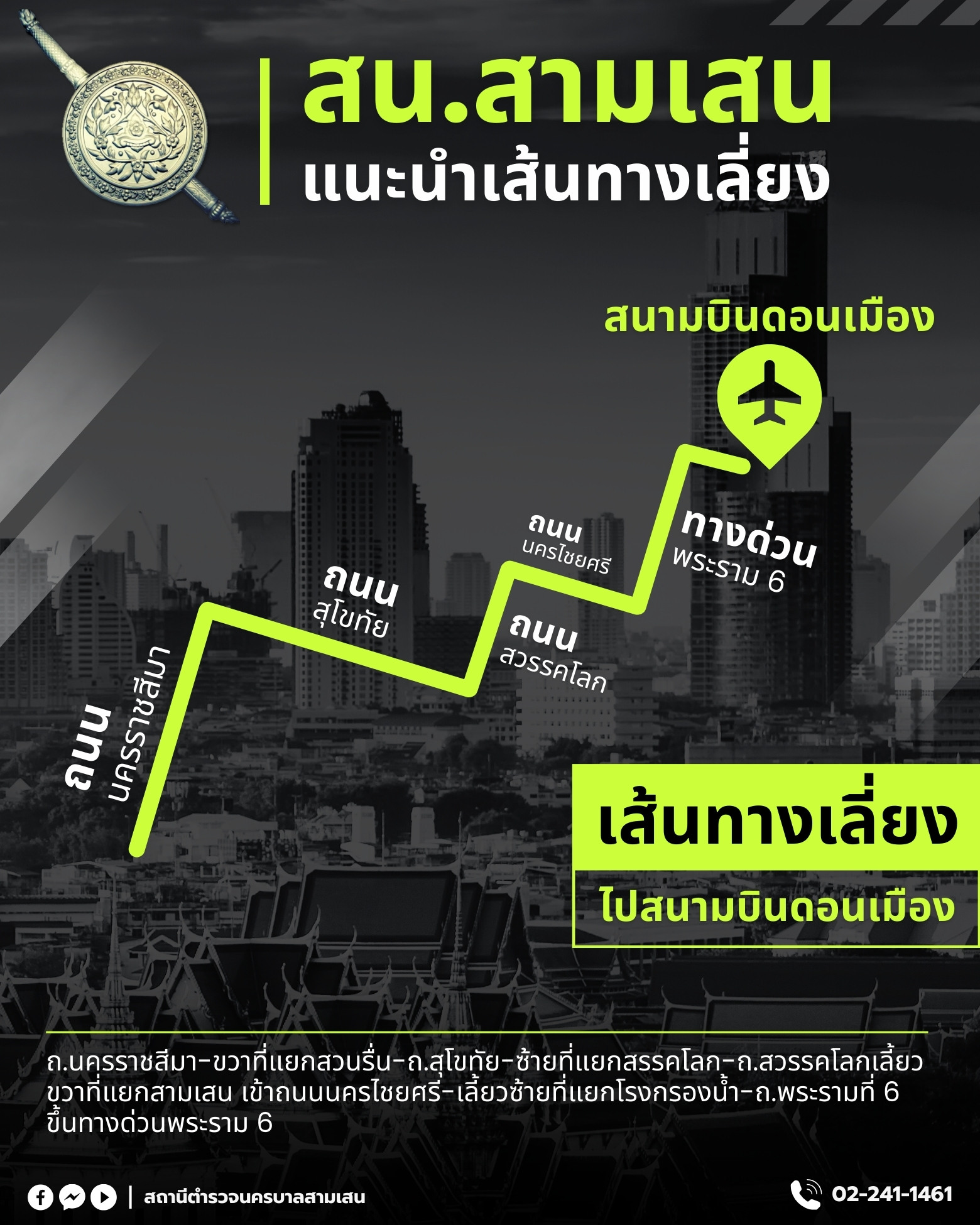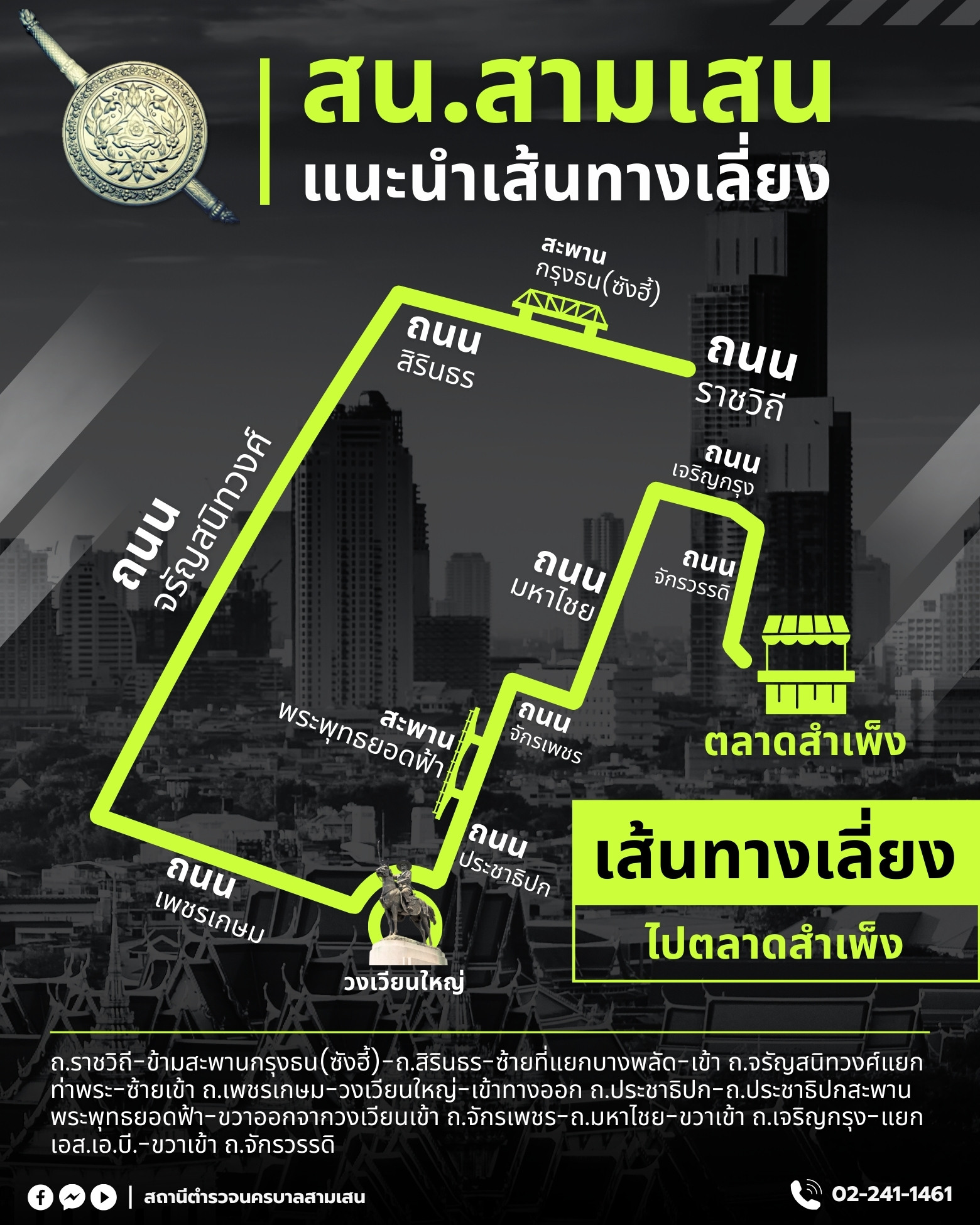 สน.สามเสน แจ้งประชาสัมพันธ์ เส้นทางเลี่ยงงาน Amazing Thailand Marathon Bangkok 2025 (ATM 2025) ซึ่งจะมีการปิดการจราจรบางช่วงเพื่อความปลอดภัยของผู้ร่วมกิจกรรม จึงขอแนะนำประชาชนวางแผนการเดินทางล่วงหน้าใช้เส้นทางเลี่ยงที่จัดทำไว้ ทั้งเส้นทางไป โบ๊เบ๊-สำเพ็ง-สนามบินดอนเมือง เพื่อหลีกเลี่ยงการจราจรหนาแน่นในพื้นที่