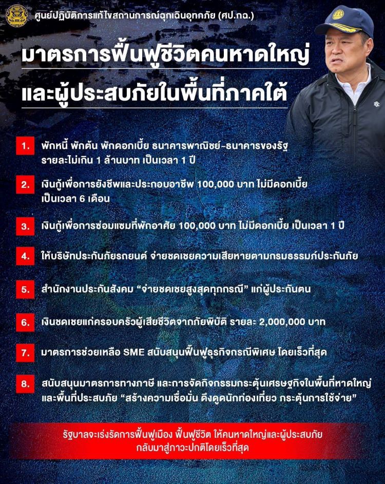 นายอนุทิน ชาญวีรกูล นายกรัฐมนตรี และ รมว.มหาดไทย เปิดเผยว่า ขณะนี้ รัฐบาลเตรียมออกมาตรการช่วยเหลือ เยียวยา ฟื้นฟู ผู้ประสบอุทกภัยในภาคใต้ เพื่อให้กลับเข้าสู่ภาวะปกติโดยเร็วที่สุด พร้อมทั้งเตรียมออก 8 มาตรการ ฟื้นฟูชีวิตคนหาดใหญ่ และผู้ประสบภัยในพื้นที่ภาคใต้ ดังนี้
