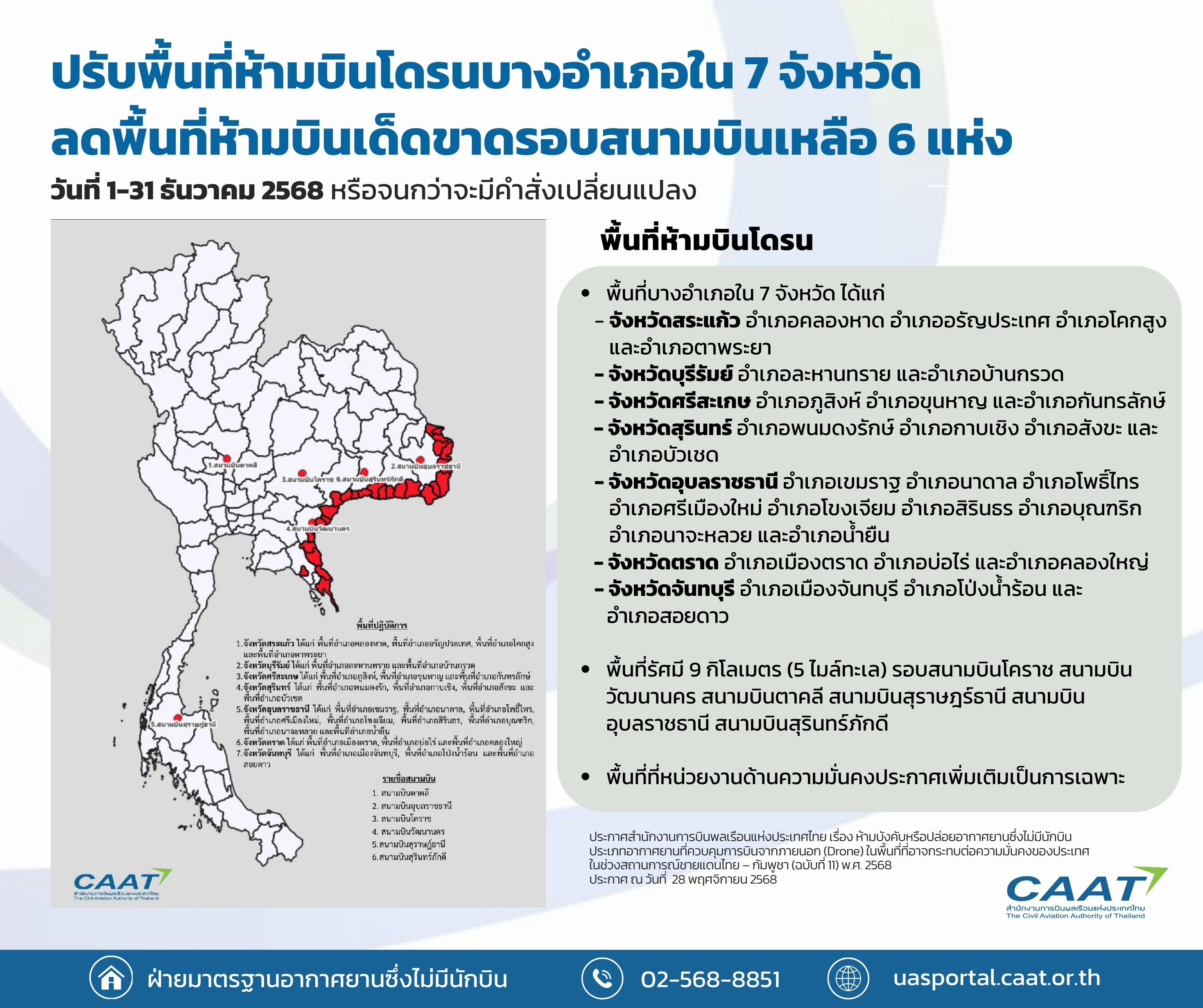 สำนักงานการบินพลเรือนแห่งประเทศไทย (กพท.) หรือ CAAT ประกาศปรับลดพื้นที่ห้ามบินเด็ดขาดรอบสนามบินเหลือ 6 แห่ง และอนุญาตให้ปฏิบัติการบินหลัง 18.00 น. ได้ โดยต้องแจ้งขอปฏิบัติการบินแตกต่างจากเงื่อนไขที่กำหนดต่อ CAAT ก่อน โดยมีผลบังคับใช้ตั้งแต่วันที่ 1-31 ธ.ค.68 หรือจนกว่าจะมีประกาศเปลี่ยนแปลง