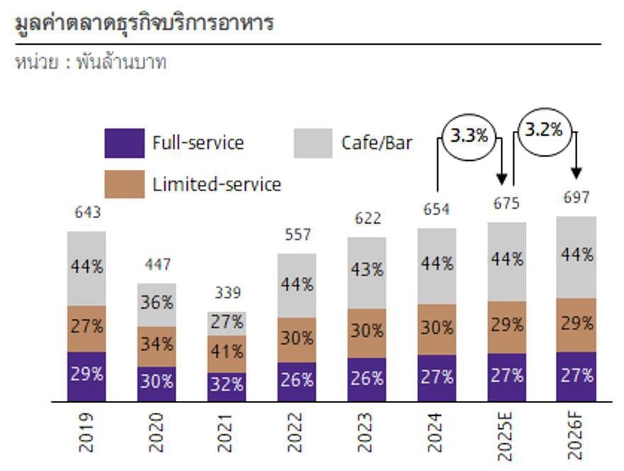 อย่างไรก็ดี ในปี 69 การเติบโตอาจจะชะลอตัวจากปี 68 เล็กน้อย เป็นผลมาจากความไม่แน่นอนทางเศรษฐกิจและมีความเสี่ยงของการชะลอตัวอยู่ค่อนข้างมาก ทำให้ผู้บริโภคลดการใช้จ่ายบางส่วนที่ไม่จำเป็นลง รวมถึงจำนวนนักท่องเที่ยวต่างชาติที่ฟื้นตัวค่อนข้างช้า ส่งผลให้ผู้บริโภคบางส่วน โดยเฉพาะกลุ่มเปราะบาง อาจลดการรับประทานอาหารนอกบ้านลง (Dine out) ทำให้ยอดขายกลุ่ม Full-service restaurant ได้รับผลกระทบ สะท้อนได้จาก SSSG ที่ติดลบอย่างต่อเนื่องในช่วงที่ผ่านมา ขณะที่กลุ่ม Limited-service มีการขยายสาขาในอัตราที่ลดลง และกลุ่ม Cafe/Bars เริ่มจะประสบปัญหา Oversupply