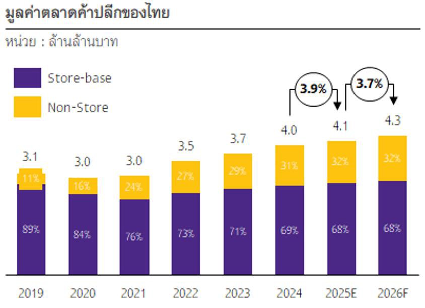 ศูนย์วิจัยเศรษฐกิจและธุรกิจ ธนาคารไทยพาณิชย์ (SCB EIC) ประเมินว่า ในปี 2569 ตลาดค้าปลีกไทย จะเติบโตที่ประมาณ 3.7% จากในปี 68 ที่คาดว่าจะเติบโตประมาณ 3.9% ซึ่งถือว่าเป็นอัตราการเติบโตที่ชะลอลงเล็กน้อย เนื่องจากภาวะเศรษฐกิจที่ยังมีความไม่แน่นอน จากปัจจัยกดดันทั้งภายในประเทศ และภายนอกประเทศ ที่ส่งผลต่อกำลังซื้อ และทำให้ผู้บริโภคเพิ่มความระมัดระวังในการใช้จ่ายมากขึ้น โดยให้ความสำคัญกับสินค้าจำเป็น และอาจชะลอการซื้อสินค้าฟุ่มเฟือยออกไป