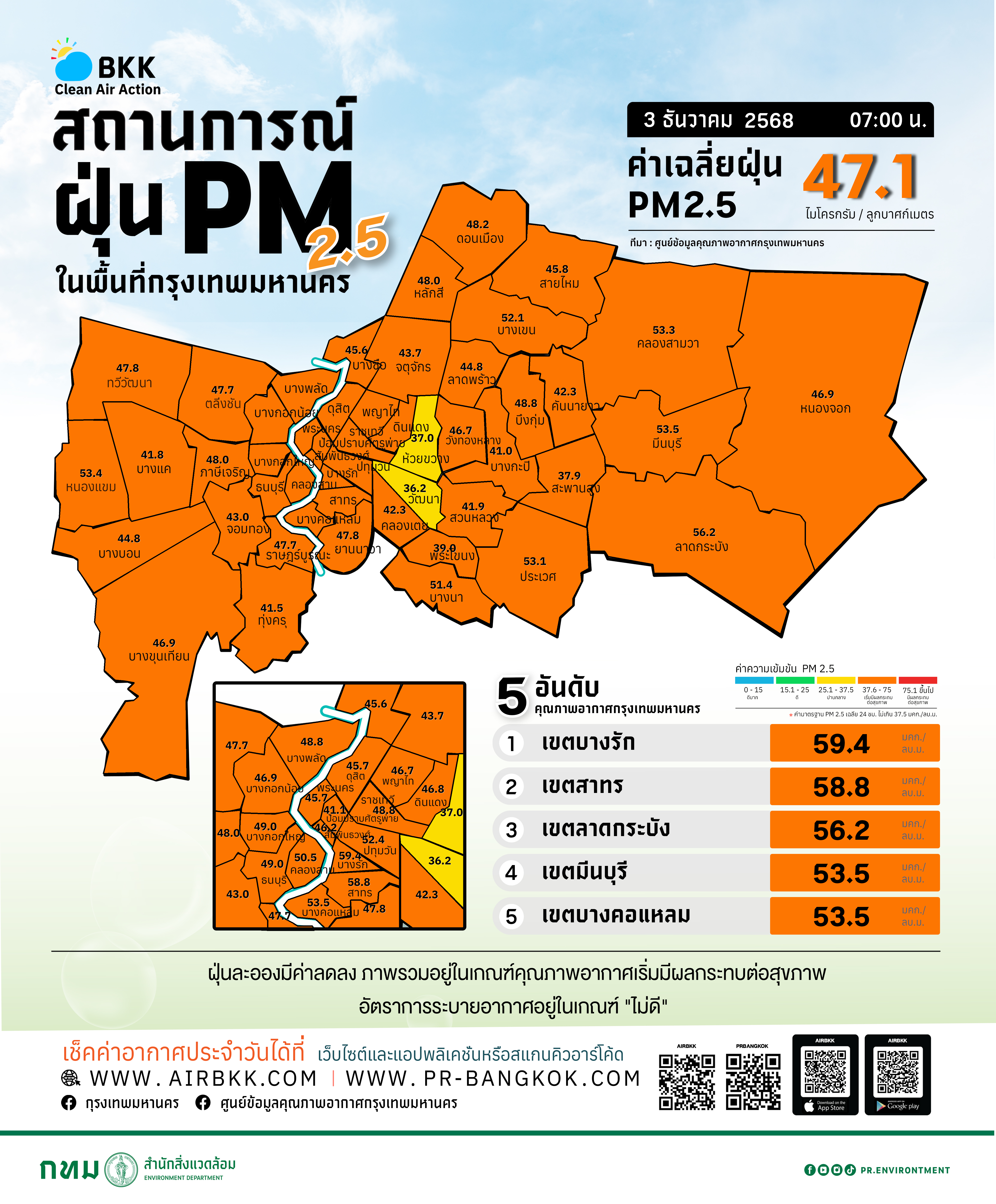 ศูนย์ข้อมูลคุณภาพอากาศกรุงเทพมหานคร (กทม.) รายงานสถานการณ์ฝุ่นละอองขนาดไม่เกิน 2.5 ไมครอน (PM 2.5) ของสถานีตรวจวัดคุณภาพอากาศของกทม. เวลา 07.00 น. ค่าเฉลี่ย 24 ชั่วโมง ตรวจวัดได้ 34.9-59.5 ไมโครกรัม/ลูกบาศก์เมตร (มคก./ลบ.ม.) พบว่า เกินมาตรฐานอยู่ในระดับสีส้ม เริ่มมีผลกระทบต่อสุขภาพ (มาตรฐานไม่เกิน 37.5 มคก./ลบ.ม.) จำนวน 62 พื้นที่ โดยพื้นที่ที่มีค่าฝุ่นสูงสุด 10 อันดับแรก คือ