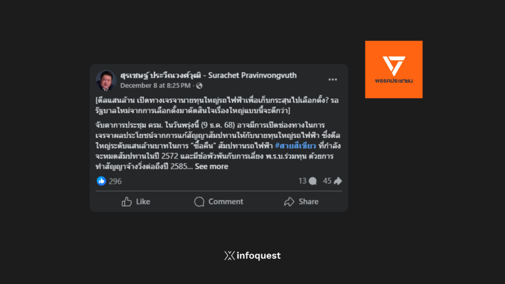 นายสุรเชษฐ์ ประวีณวงศ์วุฒิ สส.บัญชีรายชื่อ พรรคประชาชน (ปชน.) ตั้งข้อสังเกตุกรณีกระทรวงคมนาคมเตรียมเสนอที่ประชุมคณะรัฐมนตรี (ครม.) อนุมัติหลักการซื้อคืนสัมปทานรถไฟฟ้าจากภาคเอกชนจำนวน 4 สาย ประกอบด้วย สายสีเขียว สายสีชมพู สายสีเหลือง และสายสีน้ำเงิน มูลค่ากว่า 1 แสนล้านบาท เพื่อโอนกิจการให้การรถไฟฟ้าขนส่งมวลชนแห่งประเทศไทย (รฟม.) บริหารจัดการรายเดียว เป็นเรื่องใหญ่และผูกพันงบประมาณมหาศาลที่รัฐบาลชั่วคราวไม่ควรเร่งผลักดัน ทำให้มองว่าอาจมีวาระซ่อนเร้นเรื่องผลประโยชน์ที่จะนำไปใช้ในการเลือกตั้งครั้งต่อไปหรือไม่