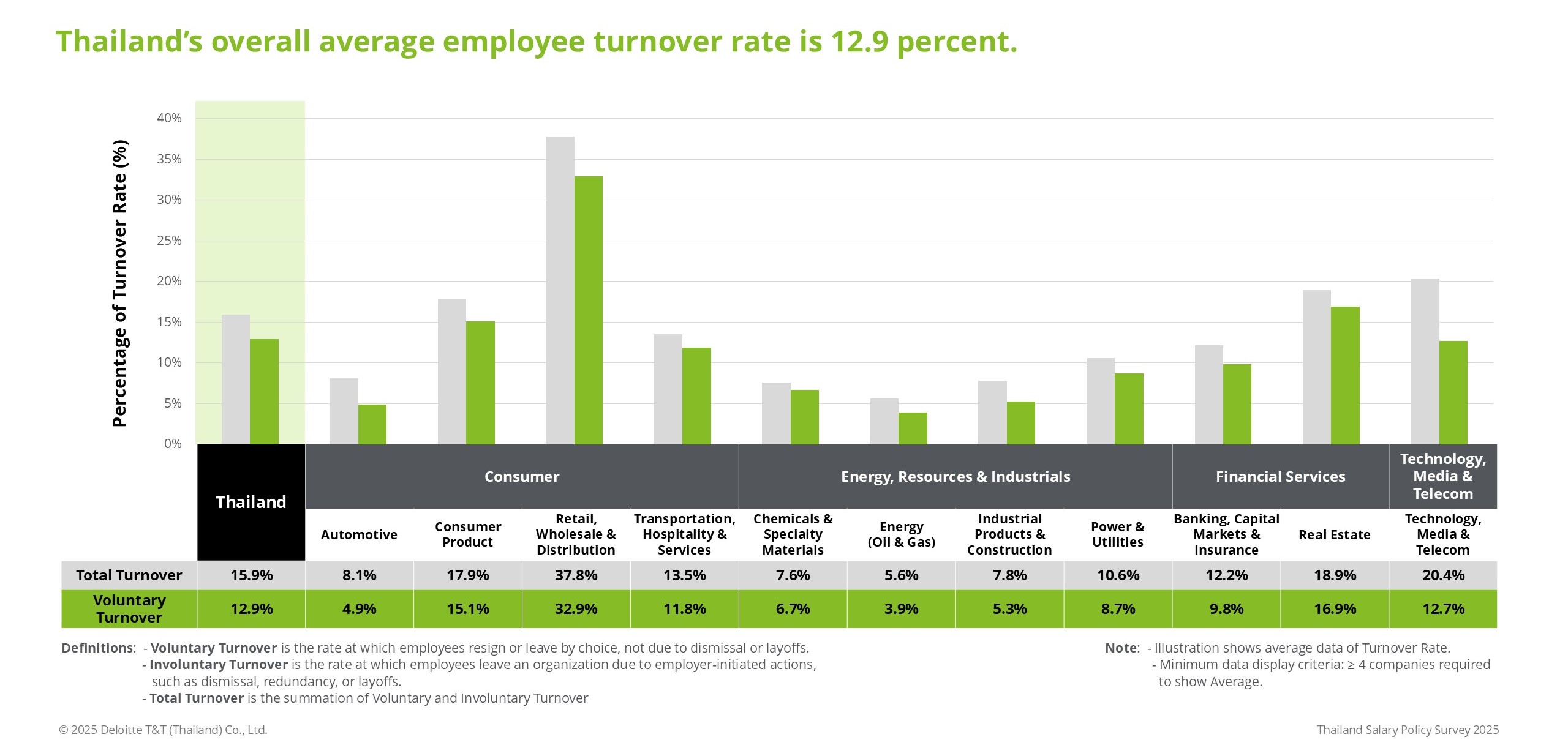 ในส่วนของโบนัสผันแปร การสำรวจแสดงให้เห็นว่าแนวโน้มการชำระเงินโดยรวมสำหรับปี 2568 ยังคงทรงตัวเมื่อเทียบกับปี 2567 โดยเฉลี่ยประมาณสองเดือน อุตสาหกรรมที่มีการจ่ายโบนัสสูงสุดในปี 2568 ได้แก่ เคมีภัณฑ์ พลังงาน และน้ำมันและก๊าซ ซึ่งจ่ายประมาณสามเดือน ในขณะที่อุตสาหกรรมที่มีระดับโบนัสต่ำกว่า ได้แก่ เทคโนโลยีและการค้าปลีก โดยมีการจ่ายโบนัสประมาณ 1.5 เดือน นอกจากนี้ ประมาณร้อยละ 28 ขององค์กรไทยยังคงให้โบนัสคงที่เพิ่มเติมอีก 1 เดือนการสำรวจพบว่าอัตราการลาออกโดยสมัครใจโดยเฉลี่ยโดยรวมของประเทศไทยอยู่ที่ร้อยละ 12.9 โดยมีความแตกต่างในแต่ละกลุ่มอุตสาหกรรม อุตสาหกรรมที่มีอัตราการหมุนเวียนสูงสุด ได้แก่ ค้าปลีกที่ร้อยละ 32.9 อสังหาริมทรัพย์ที่ร้อยละ 16.9 และสินค้าอุปโภคบริโภคที่ร้อยละ 15.1 ในทางกลับกัน อัตราการหมุนเวียนล่าสุดพบในพลังงาน น้ำมัน และก๊าซที่ร้อยละ 3.9 ยานยนต์ที่ร้อยละ 4.9 และภาคอุตสาหกรรมที่ร้อยละ 5.3