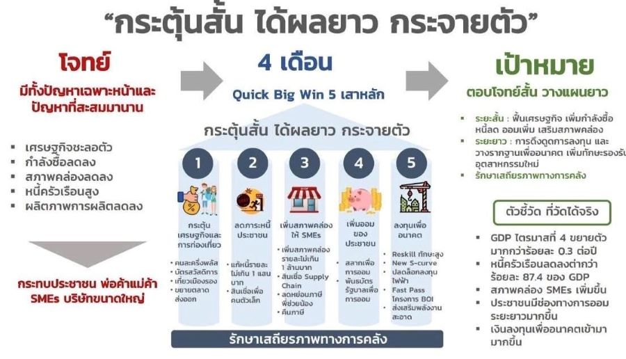 ดังนั้น นโยบายที่ออกแบบจะต้องทำได้จริง มุ่งแก้ปัญหาทั้งระยะสั้น และยาว เห็นผลเป็นรูปธรรม และคำนึงถึงความคุ้มค่าของทรัพยากรที่มีจำกัด และวินัยการคลังควบคู่กันไป เช่น คนละครึ่งพลัส (เสาที่ 1) ที่เน้นกระตุ้นเศรษฐกิจระยะสั้น โดยให้มีการ upskill ร้านค้า เพื่อผลระยะยาว และผลที่ได้กระจายตัวไปทั่วประเทศ