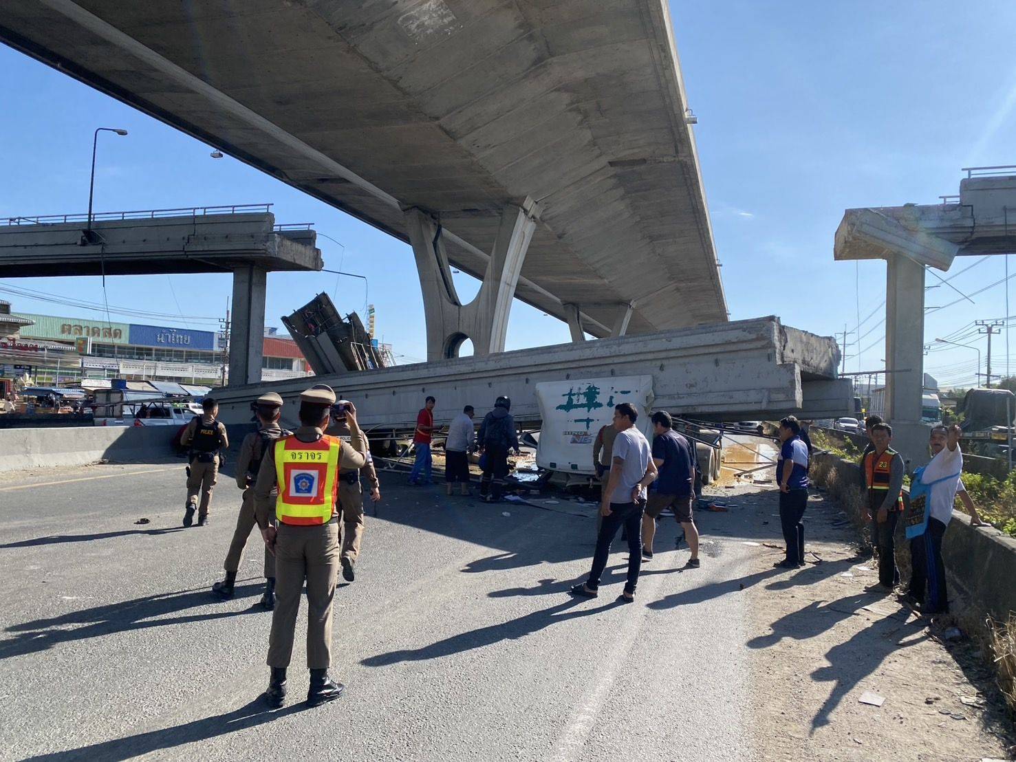 ขณะเกิดเหตุมีผู้พบเห็นเหตุการณ์รายงานว่า เห็นส่วนดั้มของรถบรรทุกอยู่ในลักษณะยกสูงค้างอยู่ ก่อนจะชนคานสะพานลอยและทำให้คานเคลื่อนตัวร่วงลงทับตัวรถบรรทุกและรถข้างเคียง ส่งผลให้คานกีดขวางทุกช่องจราจรบนทางหลักฝั่งขาเข้า เบื้องต้นมีผู้ได้รับบาดเจ็บจากเหตุการณ์ดังกล่าว ขณะนี้หน่วยกู้ชีพอยู่ระหว่างให้การช่วยเหลือและนำส่งโรงพยาบาล