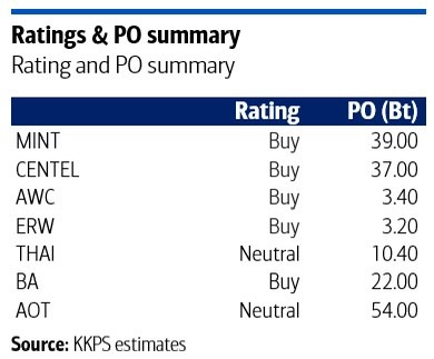 โดยรวมแล้ว KKPS มองว่า CENTEL และ BA เป็นหุ้นเด่นของกลุ่ม โดยให้น้ำหนักเชิงบวกกับ CENTEL จากแนวโน้มการเติบโตที่แข็งแกร่งและการเติบโตของกำไรที่ดี ขณะที่ BA มีมูลค่าที่ไม่แพงที่อัตราส่วนราคาต่อกำไรของหุ้น (PER) ที่ 8 เท่า อัตราผลตอบแทนจากส่วนของผู้ถือหุ้น (ROE) ที่ 22% และอัตราผลตอบแทนเงินปันผลที่ 8%