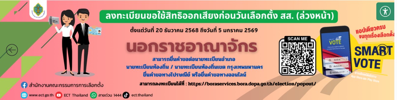 คณะกรรมการการเลือกตั้ง (กกต.) ประกาศให้ประชาชนลงทะเบียนขอใช้สิทธิเลือกตั้งล่วงหน้านอกเขตเลือกตั้ง และการเลือกตั้งล่วงหน้านอกราชอาณาจักร ตั้งแต่วันนี้ (20 ธ.ค.) ไปจนถึงวันที่ 5 ม.ค. 69 โดยประชาชนสามารถลงทะเบียนขอใช้สิทธิเลือกตั้งล่วงหน้าได้ตลอด 24 ชั่วโมง ผ่านแอปพลิเคชัน Smart Vote โดยไม่ต้องยื่นเอกสารหรือหลักฐานประกอบการลงทะเบียนเพิ่มเติม ซึ่งมีขั้นตอน ดังนี้