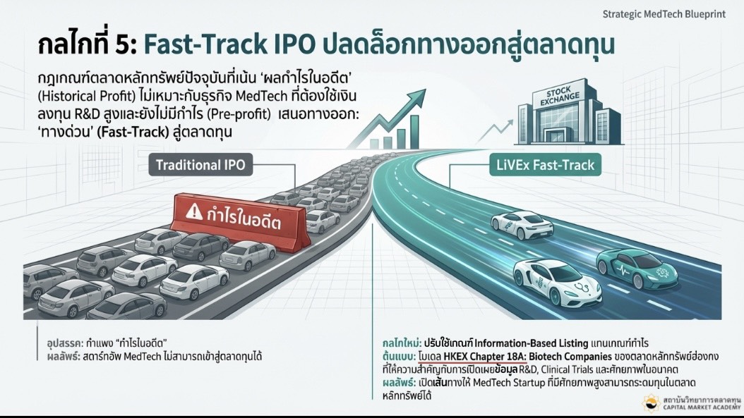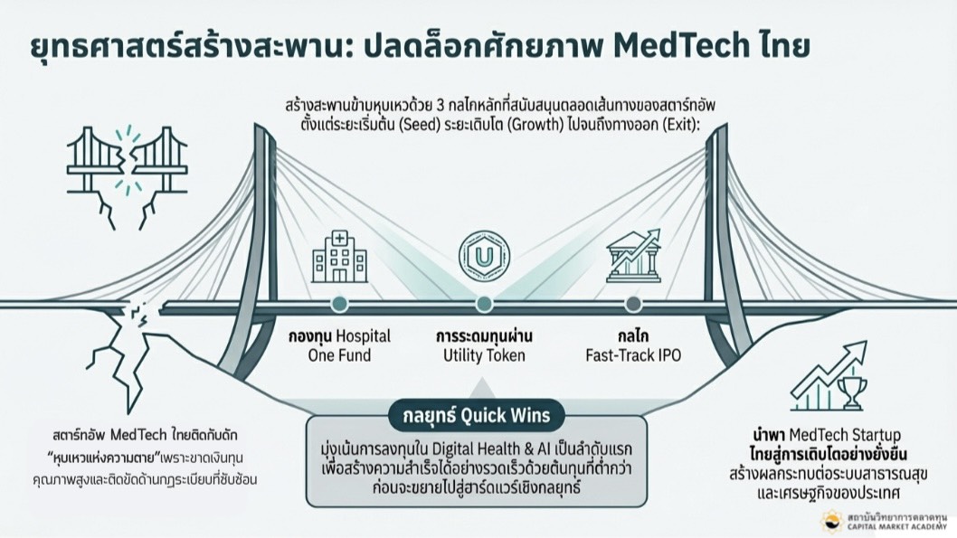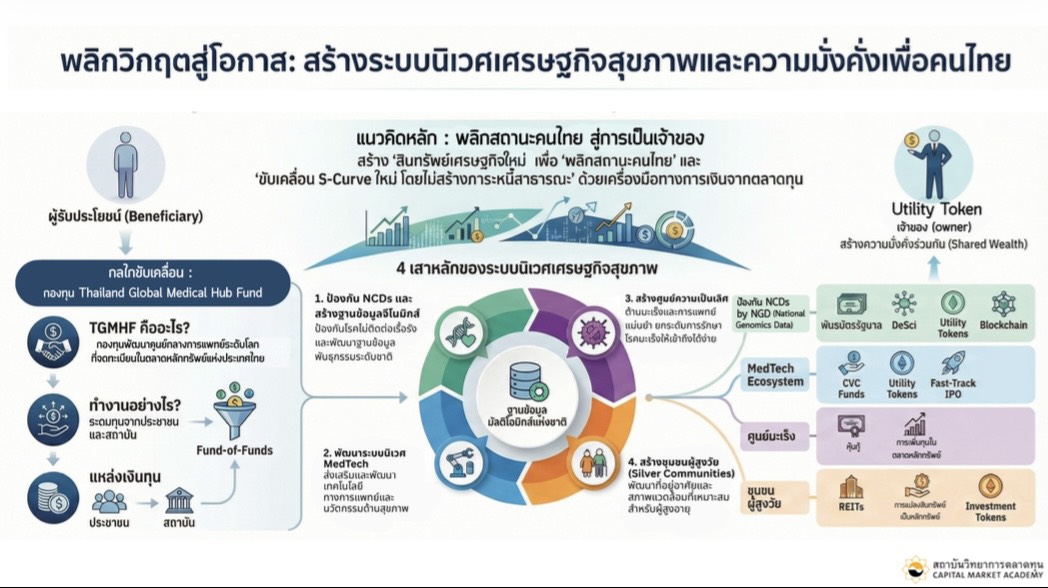 พร้อมกลไกทางการเงินสำคัญ คือ Thailand Global Medical Hub Fund (TGMHF) กองทุนระดับชาติที่ใช้ตลาดทุนเป็นเครื่องยนต์ ขับเคลื่อนประเทศไทยสู่การเป็น “ผู้สร้างนวัตกรรมสุขภาพระดับโลก ที่ไม่ใช่แค่ผู้ซื้อเทคโนโลยีจากต่างชาติ”