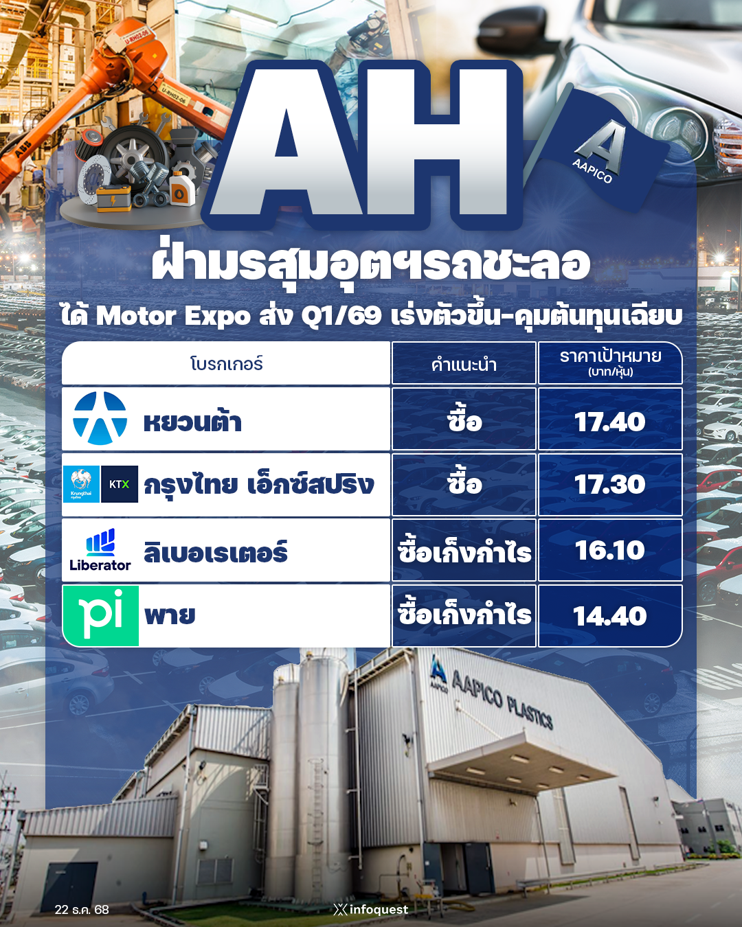 ขณะที่แนวโน้มของรายได้ในปี 69 คาดว่าจะเห็นการฟื้นตัวขึ้นมาในช่วงต้นปี 69 ที่เริ่มมีการผลิตชิ้นส่วนรถยนต์จากค่ายรถยนต์ที่ออเดอร์เข้ามา จากยอดขายของงาน Motor Expo ที่สิ้นสุดไปเมื่อต้นเดือนธ.ค.จะมีการส่งมอบรถมากขึ้นในช่วงต้นปี 69 เป็นปัจจัยหนุนต่อการฟื้นตัวของรายได้ให้กับ AH และมีโอกาสหนุนราคาหุ้นในระยะสั้น แนะนำ “ซื้อเก็งกำไร” ราคาเป้าหมาย 16.10 บาท/หุ้น