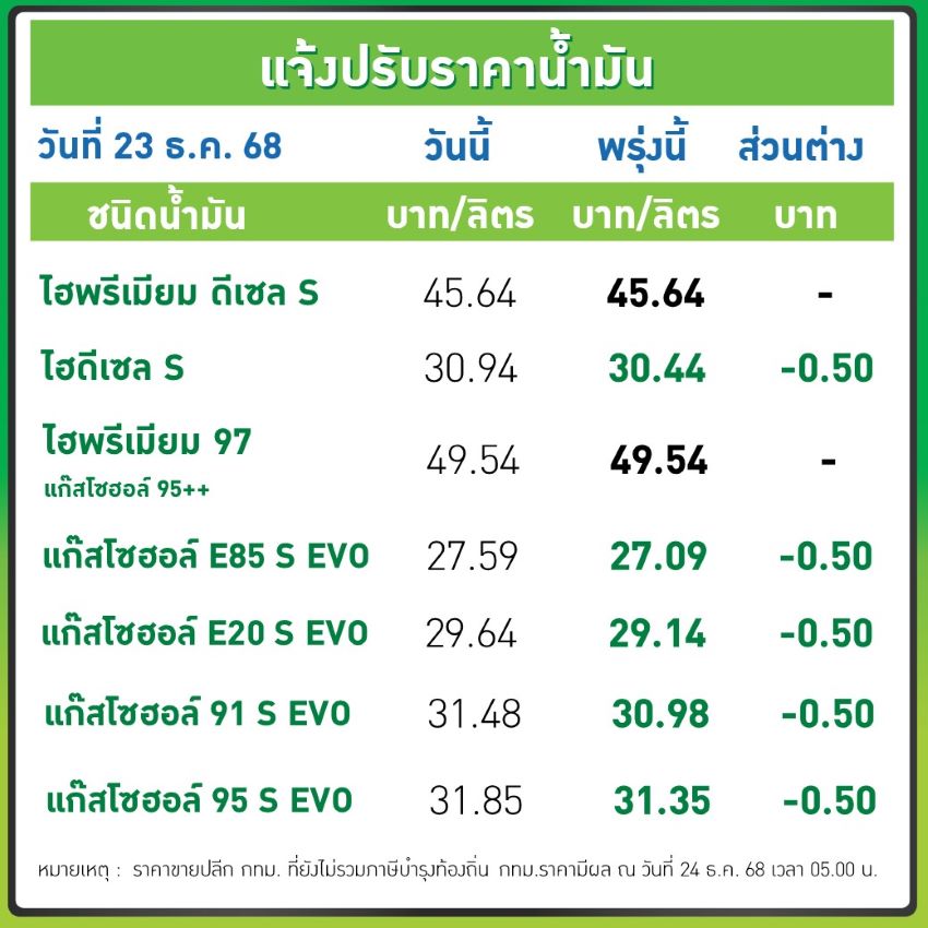 บมจ. ปตท.น้ำมันและการค้าปลีก (OR) และ บมจ.บางจาก คอร์ปอเรชั่น (BCP) ประกาศปรับลดราคาขายปลีกน้ำมันเบนซิน แก๊สโซฮอล์ทุกชนิด และกลุ่มดีเซล ลดลง 0.50 บาท/ลิตร มีผลวันที่ 24 ธ.ค.68 ตั้งแต่เวลา 05.00 น. เป็นต้นไป
