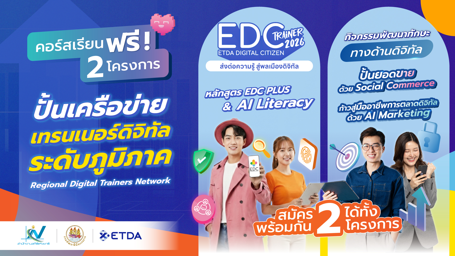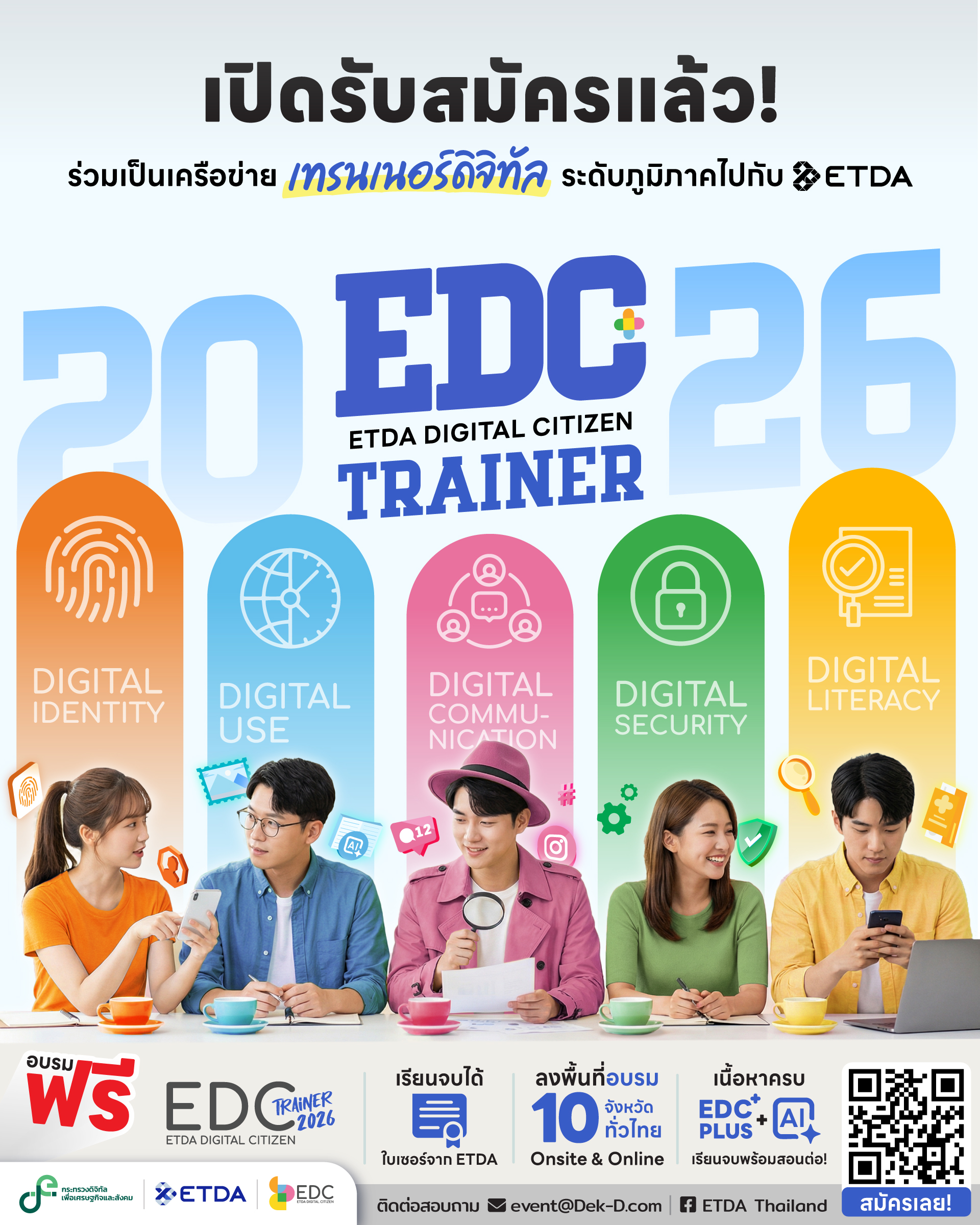 สำนักงานพัฒนาธุรกรรมทางอิเล็กทรอนิกส์ (ETDA) ประกาศขับเคลื่อนโครงการ EDC (ETDA Digital Citizen) ประจำปีงบประมาณ 2569 ผ่านโมเดล ‘Regional Digital Trainers Network’ โดยเตรียมปูพรมจัดกิจกรรมครอบคลุม 15 จังหวัดทั่วประเทศ เพื่อสร้างเครือข่ายเทรนเนอร์ดิจิทัลระดับภูมิภาคเพิ่มขึ้นอีกกว่า 2,000 คน พร้อมตั้งเป้าส่งต่อทักษะดิจิทัลให้แก่ประชาชนในพื้นที่ไม่น้อยกว่า 60,000 คน ภายใต้การบูรณาการความร่วมมือกับสำนักงานสถิติแห่งชาติและกรมพัฒนาฝีมือแรงงาน เพื่อนำข้อมูลเชิงพื้นที่มาออกแบบการพัฒนาทักษะผ่าน 4 หลักสูตรสำคัญ ตั้งแต่ระดับพื้นฐานไปจนถึงการใช้เทคโนโลยีเชิงธุรกิจ โดยได้เริ่มนำร่องกิจกรรมแรก ณ จังหวัดน่าน เมื่อวันที่ 18–19 ธันวาคม 2568 ที่ผ่านมา