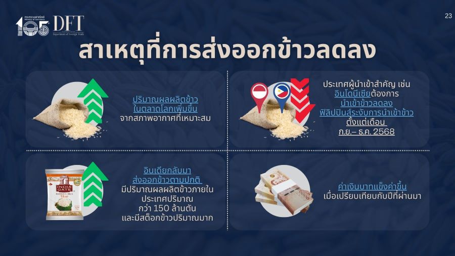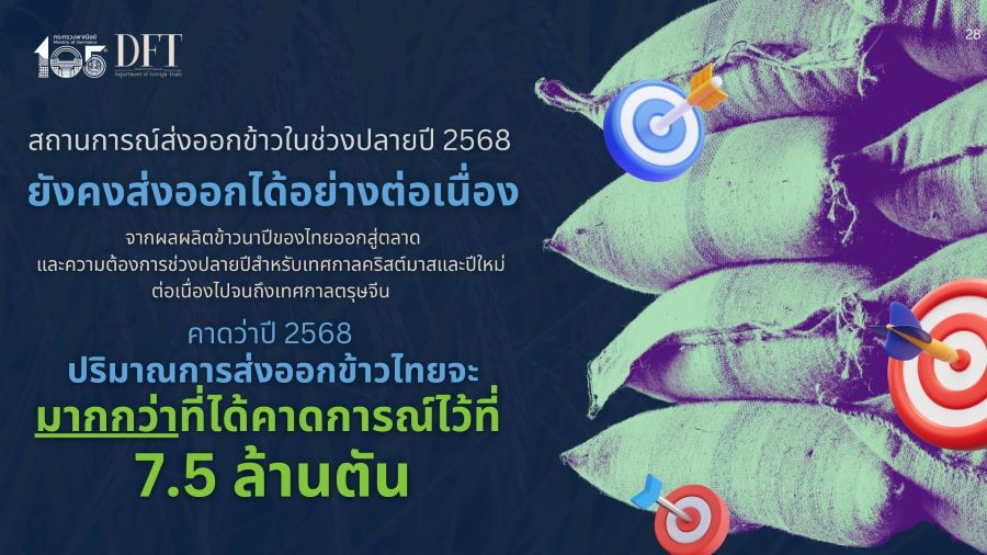 กระทรวงพาณิชย์ กรมการค้าต่างประเทศ คาดปี 69 ส่งออกข้าว 7 ล้านตัน ลดลงจากปีนี้คาดส่งออกได้มากกว่า 7.5 ล้านตัน เหตุยังแข่งขันสูงจากผลผลิตข้าวโลกที่มีปริมาณมาก และการระบายสต๊อกข้าวของอินเดียที่กดดันราคาตลาด กางแผนเดินหน้ารักษาตลาดเดิมและขยายตลาดศักยภาพ
