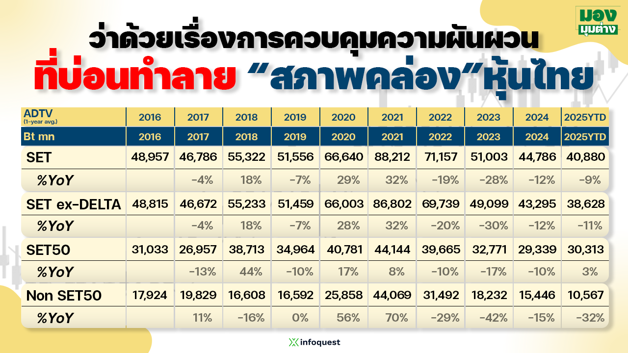 แต่ความจริงแล้ว สิ่งที่เปลี่ยนไปอย่างรุนแรงไม่ใช่ระดับดัชนี หากคือ “โครงสร้างสภาพคล่อง” ของตลาดหุ้นไทย และการเปลี่ยนแปลงนี้กำลังทำลายตลาดฯ จากภายในอย่างเงียบ ๆ