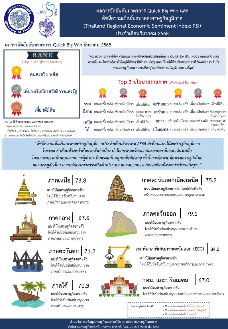 นอกจากนี้ กระทรวงการคลัง ได้จัดทำแบบสำรวจพิเศษเพื่อประเมินนโยบาย Quick Big Win พบว่า “โครงการคนละครึ่ง พลัส” “โครงการเพิ่มวงเงินสวัสดิการให้แก่ผู้มีบัตรสวัสดิการแห่งรัฐ ปี 2568” และ “โครงการเที่ยวดีมีคืน” เป็นมาตรการที่ส่งผลต่อการเติบโตทางเศรษฐกิจ และความเป็นอยู่ของประชาชนในภูมิภาคมากที่สุด
