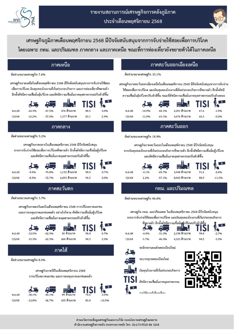 นายวินิจ วิเศษสุวรรณภูมิ ผู้อำนวยการสำนักงานเศรษฐกิจการคลัง (สศค.) เปิดเผยภาวะเศรษฐกิจภูมิภาค ประจำเดือนพ.ย. 68 มีปัจจัยสนับสนุนจากการจับจ่ายใช้สอยเพื่อการบริโภค โดยเฉพาะ กทม. และปริมณฑล ภาคกลาง และภาคเหนือ ขณะที่การท่องเที่ยวยังขยายตัวได้ในภาคเหนือ
