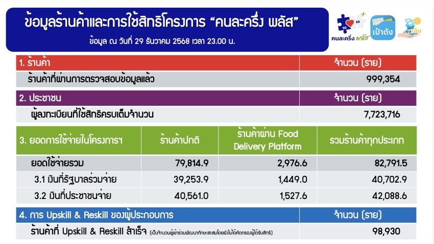 น.ส.ลลิดา เพริศวิวัฒนา รองโฆษกประจำสำนักนายกรัฐมนตรี เปิดเผยว่า ตามที่โครงการ “คนละครึ่ง พลัส” ซึ่งได้เริ่มดำเนินการมาตั้งแต่วันที่ 29 ต.ค.68 และจะครบกำหนดในวันที่ 31 ธ.ค.68 นั้น ขณะนี้ จากข้อมูลร้านค้าและการใช้สิทธิตามโครงการดังกล่าว พบว่ามีประชาชน ใช้สิทธิในการใช้จ่ายเต็มวงเงิน (2,000 หรือ 2,400 บาท แล้วแต่ละกรณี) ครบแล้ว 7.72 ล้านคน แต่ยังมีประชาชนอีกประมาณ 13 ล้านคน ที่ยังใช้สิทธิไม่เต็มวงเงินที่ได้รับ หรือคิดเป็นวงเงินที่ยังไม่ได้ใช้สิทธิ อีกประมาณ 6,000 ล้านบาท