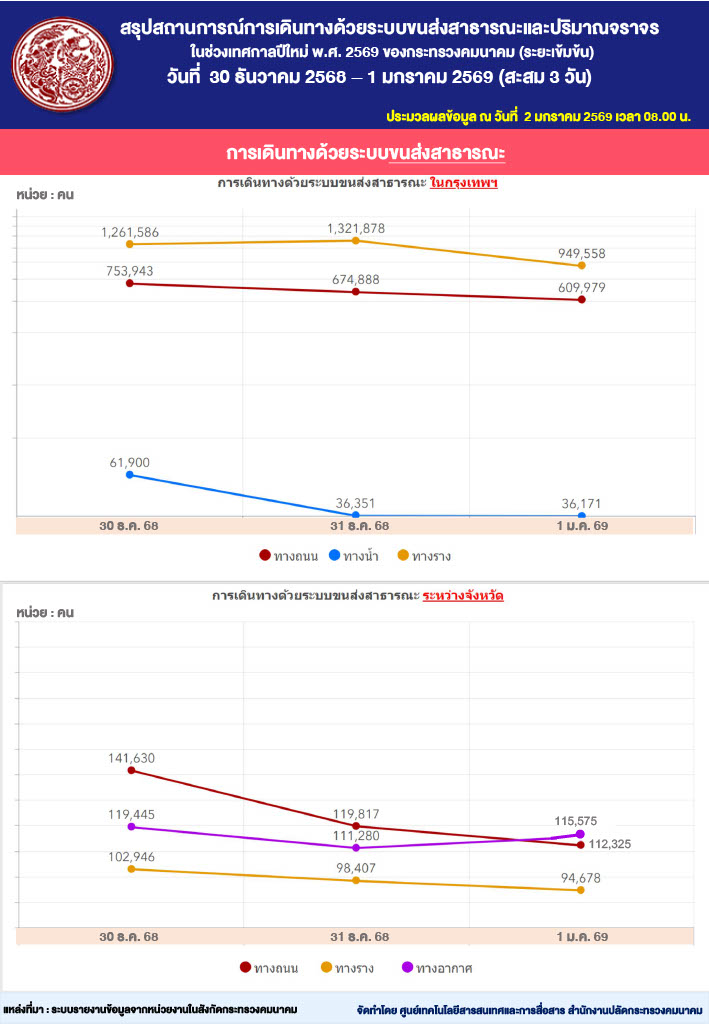 ศูนย์ปฏิบัติการความปลอดภัยคมนาคม (ศปภ.คค.) กระทรวงคมนาคม สรุปข้อมูลการเดินทางบนโครงข่ายคมนาคม สะสม 3 วัน (วันที่ 30 ธันวาคม 2568 – 1 มกราคม 2569) (ข้อมูล ณ วันที่ 2 มกราคม 2569 เวลา 08.00 น.) พบว่า ระบบขนส่งสาธารณะสามารถรองรับการเดินทางของประชาชนได้อย่างเพียงพอ มีการเดินทางด้วยระบบขนส่งสาธารณะรวม 8,267,576 คน ลดลงร้อยละ 3.88 เปรียบเทียบกับวันที่ 27 – 28 ธันวาคม 2567 แบ่งเป็นการเดินทางด้วยระบบขนส่งสาธารณะภายในประเทศ 7,458,167 คน โดยระบบรางมีสัดส่วนการใช้บริการสูงสุด คิดเป็นร้อยละ 45 ขณะที่ผู้ใช้บริการสูงสุดในแต่ละภูมิภาค ได้แก่ ภาคกลาง (ทางอากาศขาออก) 162,994 คน ภาคใต้ (ทางราง) 102,504 คน ภาคตะวันออกเฉียงเหนือ (ทางถนน) 84,557 คน ภาคเหนือ (ทางราง) 54,203 คน และภาคตะวันออก (ทางถนน) 59,570 คน ส่วนการเดินทางด้วยระบบขนส่งสาธารณะระหว่างประเทศมีจำนวนรวม 809,409 คน ลดลงร้อยละ 4.6 สำหรับการจราจรเข้า – ออกกรุงเทพฯ บนทางหลวงสายหลัก 12 เส้นทาง มีปริมาณ 3,107,227 คัน ลดลงร้อยละ 6.15 และการเดินทางภายในกรุงเทพฯ บนทางด่วนของการทางพิเศษแห่งประเทศไทย มีปริมาณ 3,825,040 คัน ลดลงร้อยละ 20.99