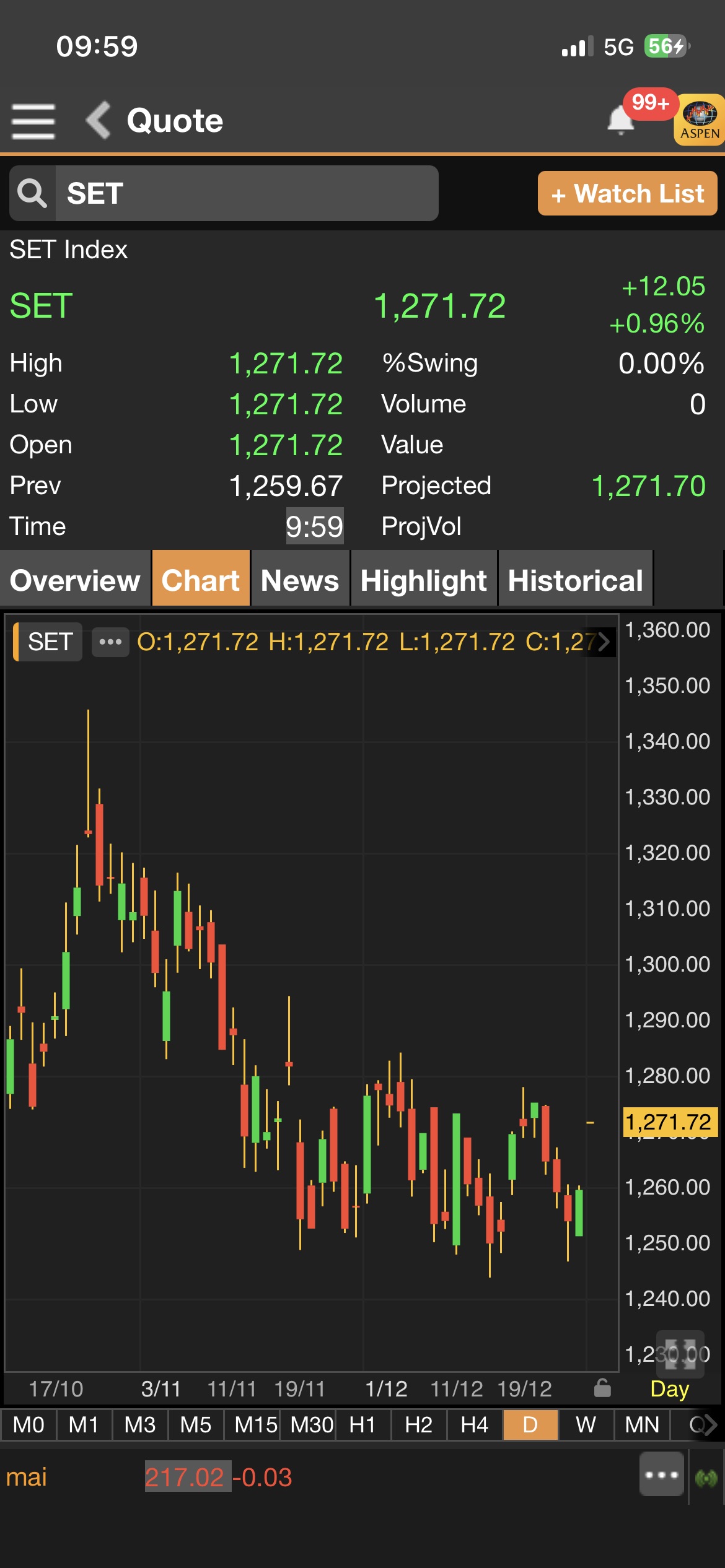 เมื่อเวลา 09.59 น.ดัชนี SET มาอยู่ที่ 1,271.72 จุด เพิ่มขึ้น 12.05 จุด (+0.96%)