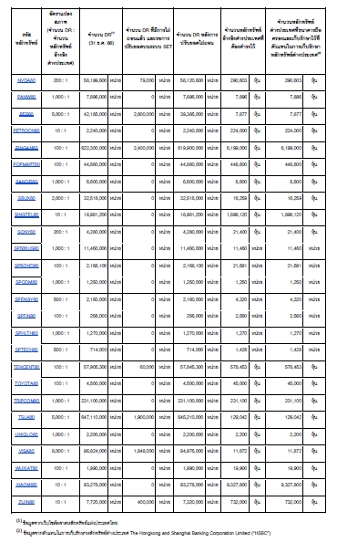 ทั้งนี้ ธนาคารได้มีการเปิดเผยข้อมูลดังกล่าว โดยการจัดทำและส่งรายงานข้อมูลเกี่ยวกับจำนวนตราสารแสดงสิทธิในหลักทรัพย์ต่างประเทศที่มีการออกและไถ่ถอน จำนวนคงเหลือ และจำนวนหลักทรัพย์อ้างอิงต่างประเทศ ณ สิ้นวันทำการสุดท้ายของทุกเดือนให้กับสำนักงาน ก.ล.ต. โดยนำส่งผ่านระบบการรับส่งข้อมูลของตลาดหลักทรัพย์แห่งประเทศไทย
