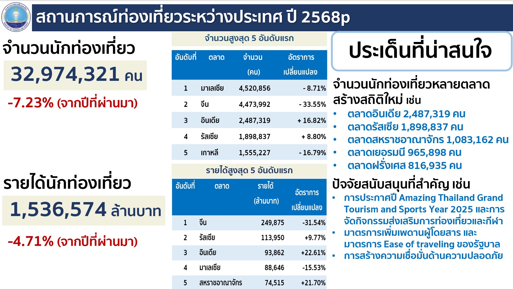 น.ส.นัทรียา ทวีวงศ์ ปลัดกระทรวงการท่องเที่ยวและกีฬา กล่าวว่า ภาพรวมนักท่องเที่ยวชาวต่างชาติที่เดินทางเข้ามาท่องเที่ยวในปี 68 ตั้งแต่วันที่ 1 ม.ค. ถึง 31 ธ.ค. 68 มีจำนวน 32,974,321 คน สร้างรายได้จากการใช้จ่ายของนักท่องเที่ยวต่างชาติแล้ว 1.53 ล้านล้านบาท