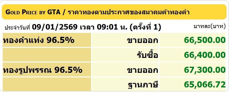 – ทองคำแท่ง 96.5% รับซื้อ บาททองคำละ 66,400 บาท ขายออก บาททองคำละ 66,500 บาท