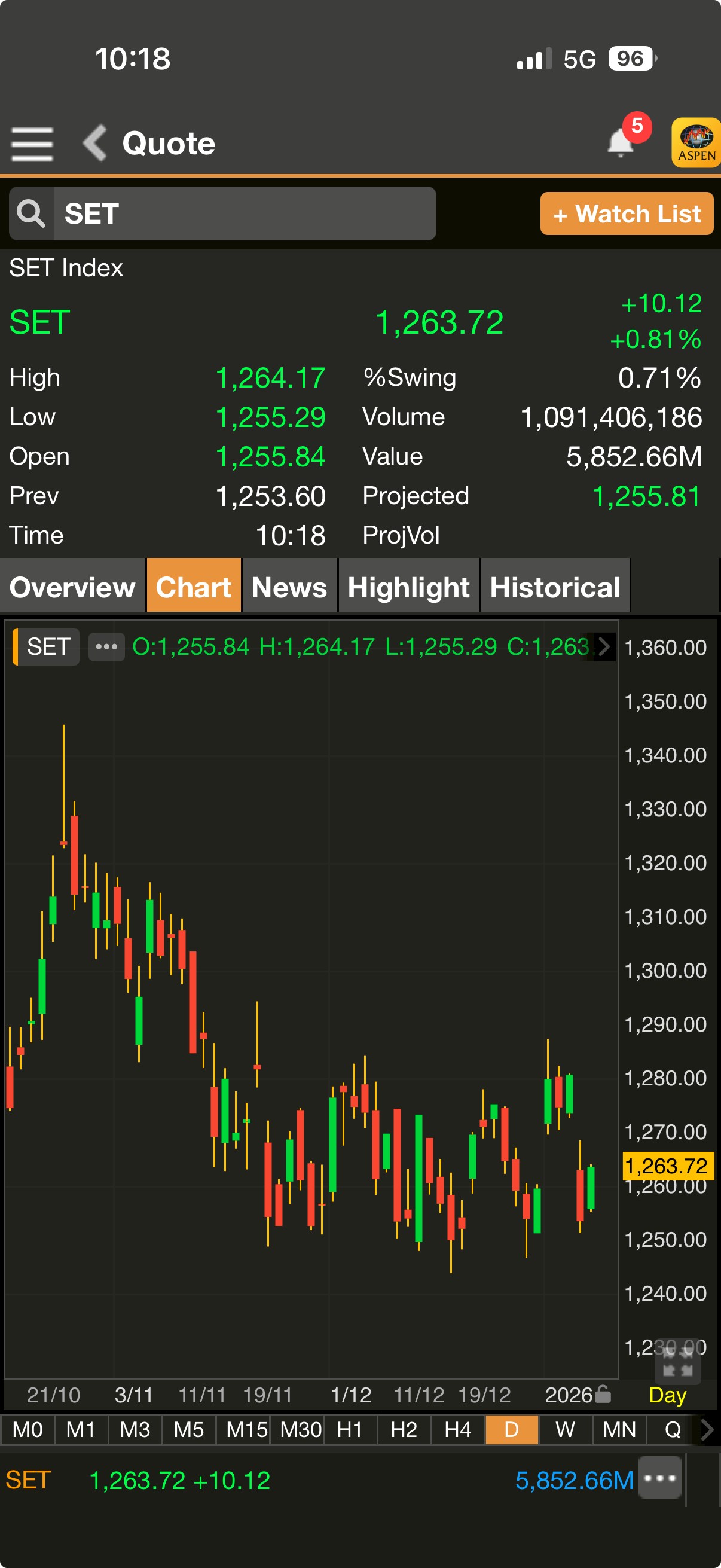 เมื่อเวลา 10.18 น. ดัชนี SET มาอยู่ที่ 1,263.72 จุด เพิ่มขึ้น 10.12 จุด (+0.81%)