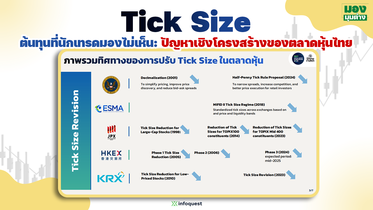 โดยเนื้อหาทั้ง 7 สไลด์ พยายามชี้ให้เห็นความเชื่อมโยงเชิงโครงสร้างระหว่าง Tick size, bid-ask spread, สภาพคล่อง และต้นทุนการซื้อขายของตลาดหุ้นไทย