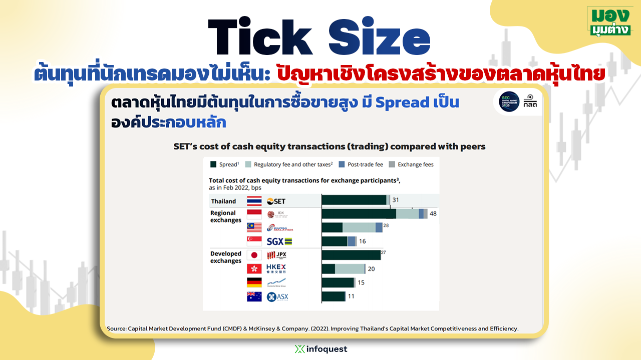 เมื่อเชื่อมโยงกับต้นทุนการซื้อขาย ภาพเปรียบเทียบค่าธรรมเนียมกับตลาดอื่นแสดงให้เห็นว่า spread เป็นองค์ประกอบหลักของต้นทุนการซื้อขายในตลาดหุ้นไทย มากกว่าค่าธรรมเนียมตลาดหรือค่าธรรมเนียมหลังการซื้อขาย ซึ่งต่างจากหลายตลาดที่ spread ต่ำกว่าอย่างมีนัยสำคัญ