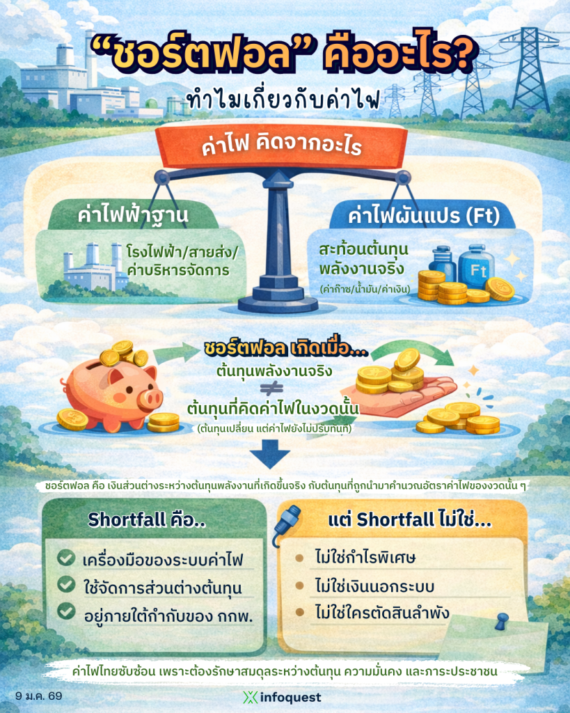 โดยสรุป “ชอร์ตฟอล” ในระบบค่าไฟ คือ ส่วนต่างของต้นทุนจริงที่ต้องพิจารณาผ่านกลไกค่าไฟฟ้าผันแปร (Ft) ภายใต้การกำกับดูแลของคณะกรรมการกำกับกิจการพลังงาน (กกพ.)