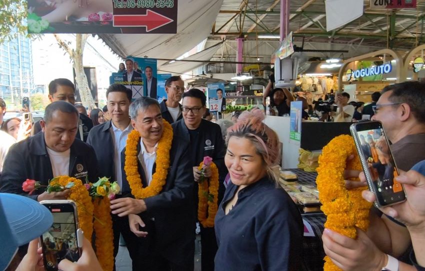นายอภิสิทธิ์ เวชชาชีวะ หัวหน้าพรรคประชาธิปัตย์ (ปชป.) และแคนดิเดตนายกรัฐมนตรีของพรรค พร้อมด้วย นายสกลธี ภัททิยกุล รองหัวหน้าพรรคดูแลพื้นที่กรุงเทพฯ และนายองอาจ คล้ามไพบูลย์ ที่ปรึกษาหัวหน้าพรรค ลงพื้นที่ตลาดนัดเมืองไทยภัทร เพื่อช่วยผู้สมัคร สส.ของพรรคหาเสียงในพื้นที่ห้วยขวาง-วังทองหลาง โดยบรรยากาศเป็นไปอย่างคึกคัก บรรดาพ่อค้า-แม่ค้า ร่วมมอบดอกกุหลาบ พวงมาลัยดาวเรือง พร้อมถ่ายรูป และให้กำลังใจ