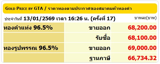 - ทองคำแท่ง 96.5% รับซื้อ บาททองคำละ 68,100 บาท ขายออก บาททองคำละ 68,200 บาท