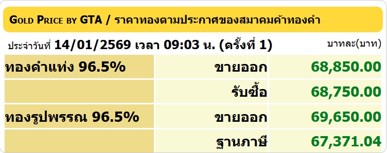 - ทองคำแท่ง 96.5% รับซื้อ บาททองคำละ 68,750 บาท ขายออก บาททองคำละ 68,850 บาท