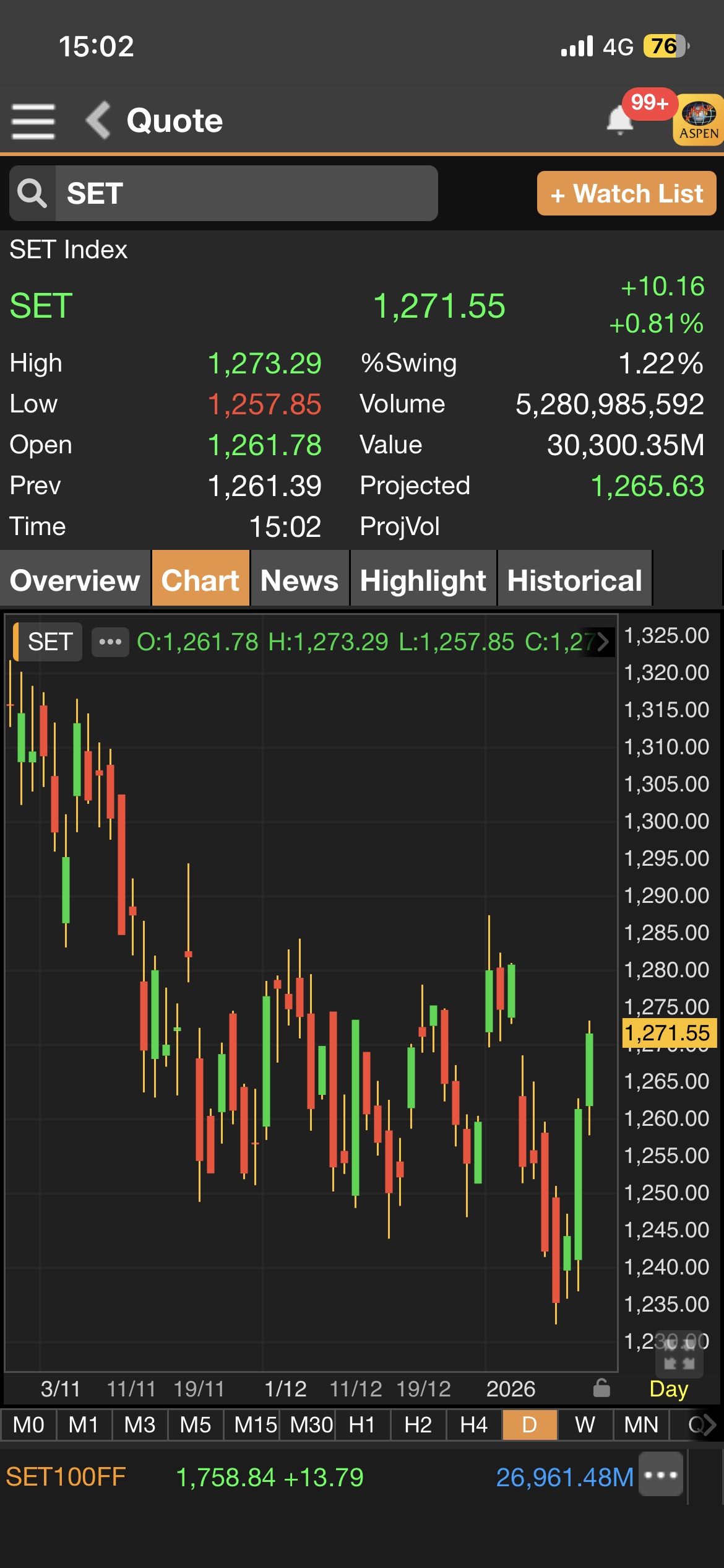 • เมื่อเวลา 15.02 น.ดัชนี SET มาอยู่ที่ 1,271.55 จุด เพิ่มขึ้น 10.16 จุด (+0.81%)