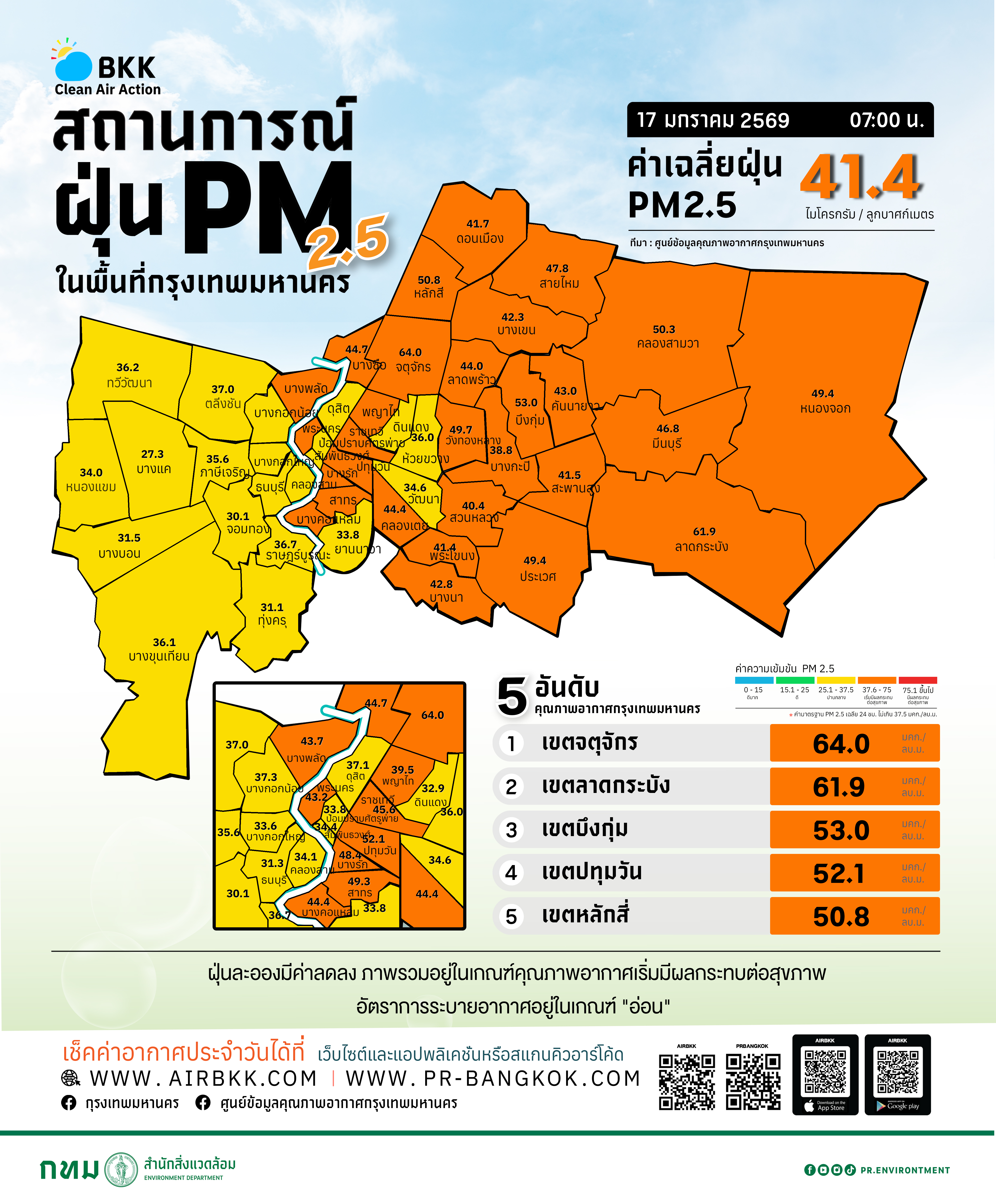 ศูนย์ข้อมูลคุณภาพอากาศกรุงเทพมหานคร (กทม.) รายงานสถานการณ์ฝุ่นละอองขนาดไม่เกิน 2.5 ไมครอน (PM 2.5) ในพื้นที่ กทม.เมื่อเวลา 07.00 น.ตรวจวัดได้ 24.3-62 ไมโครกรัม/ลูกบาศก์เมตร (มคก./ลบ.ม.) โดยมีค่าเฉลี่ยอยู่ที่ 41.4 ไมโครกรัมต่อลูกบาศก์เมตร (มคก./ลบ.ม.) ซึ่งเกินค่ามาตรฐาน 37.5 มคก./ลบ.ม.อยู่ในระดับสีส้มที่เริ่มมีผลกระทบต่อสุขภาพ จำนวน 32 พื้นที่ คือ