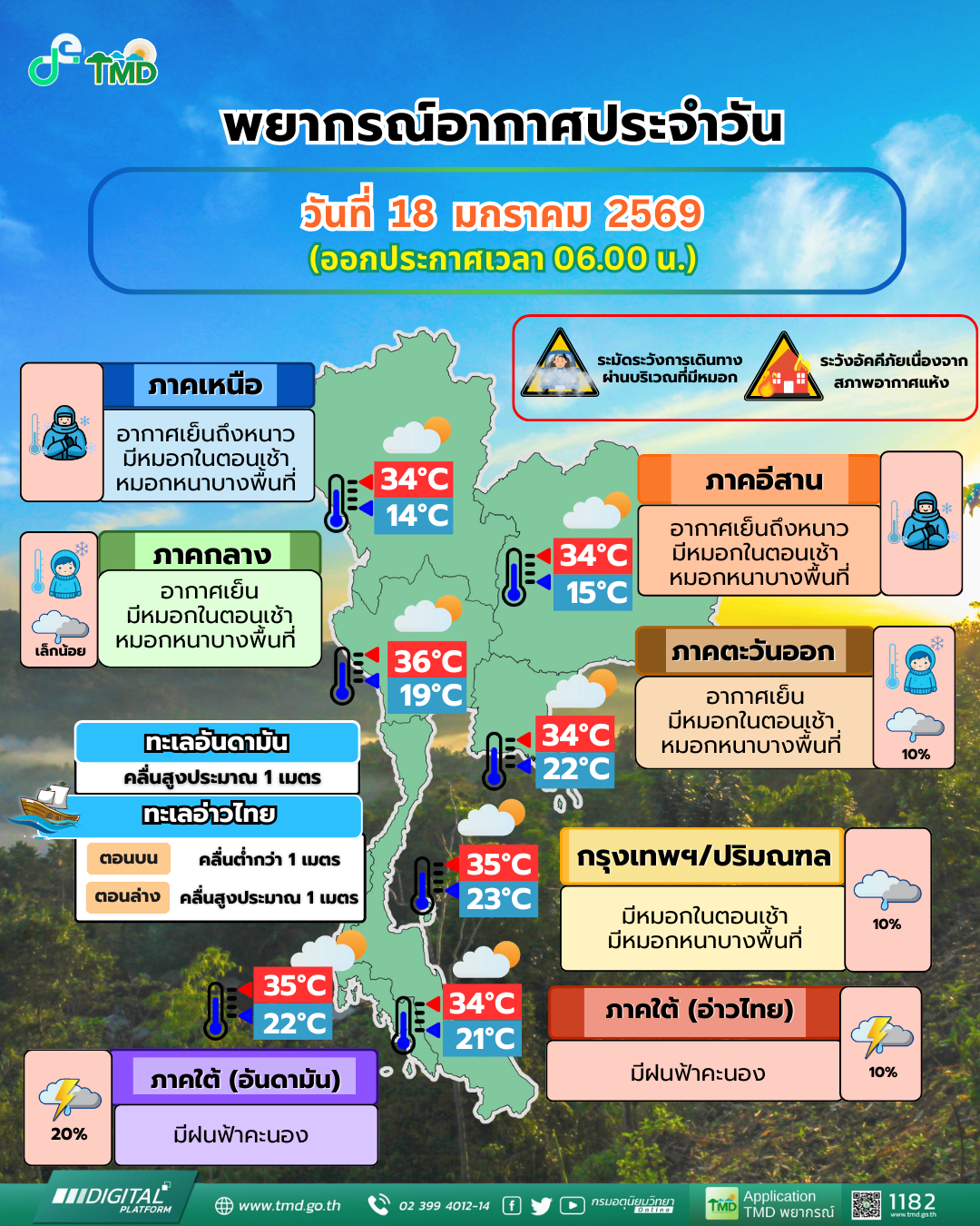กรมอุตุนิยมวิทยาพยากรณ์อากาศ 24 ชั่วโมงข้างหน้า ประเทศไทยตอนบนมีอากาศเย็นกับมีหมอกในตอนเช้าและมีหมอกหนาบางพื้นที่ โดยภาคเหนือและภาคตะวันออกเฉียงเหนือตอนบนยังคงมีอากาศเย็นถึงหนาว เนื่องจากบริเวณความกดอากาศสูงหรือมวลอากาศเย็นกำลังอ่อนปกคลุมประเทศไทยตอนบน ในขณะที่ลมฝ่ายตะวันตกจากประเทศเมียนมาเคลื่อนเข้าปกคลุมภาคเหนือตอนบนและลาวตอนบน ส่วนภาคกลางตอนล่างและภาคตะวันออกมีฝนเล็กน้อยบางแห่ง เนื่องจากมีลมตะวันออกเฉียงใต้พัดนำความชื้นเข้ามาปกคลุม ขอให้ประชาชนดูแลรักษาสุขภาพเนื่องจากสภาพอากาศที่เปลี่ยนแปลง และเพิ่มความระมัดระวังในการสัญจรผ่านบริเวณที่มีหมอก รวมทั้งระวังอันตรายจากอัคคีภัยเนื่องจากสภาพอากาศแห้งไว้ด้วย
